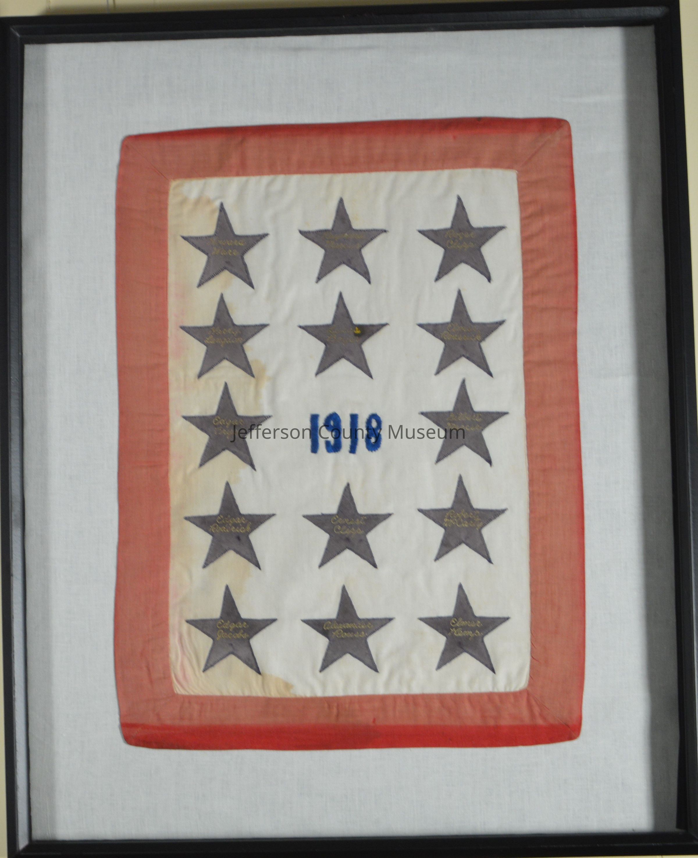 (B) Cotton banner with white background and red border machine-stitched to background. Fourteen blue stars names of Kabletown-area soldiers written in script in gold and "1918" embroidered in blue in center. Names in first row (left to right): Howard Ware, Raymond Marcus, Roger Clipp. Second row: Harry Langdon, Lucas Boyer, Elmer Roderick. Middle row: Edgar Frye, "1918", Gilbert Mercer. Fourth row: Edgar Roderick, Ernest Clipp, Robert McCarty. Bottom row: Edgar Jacobs, Alexander Rouss, Elmer Kemp.