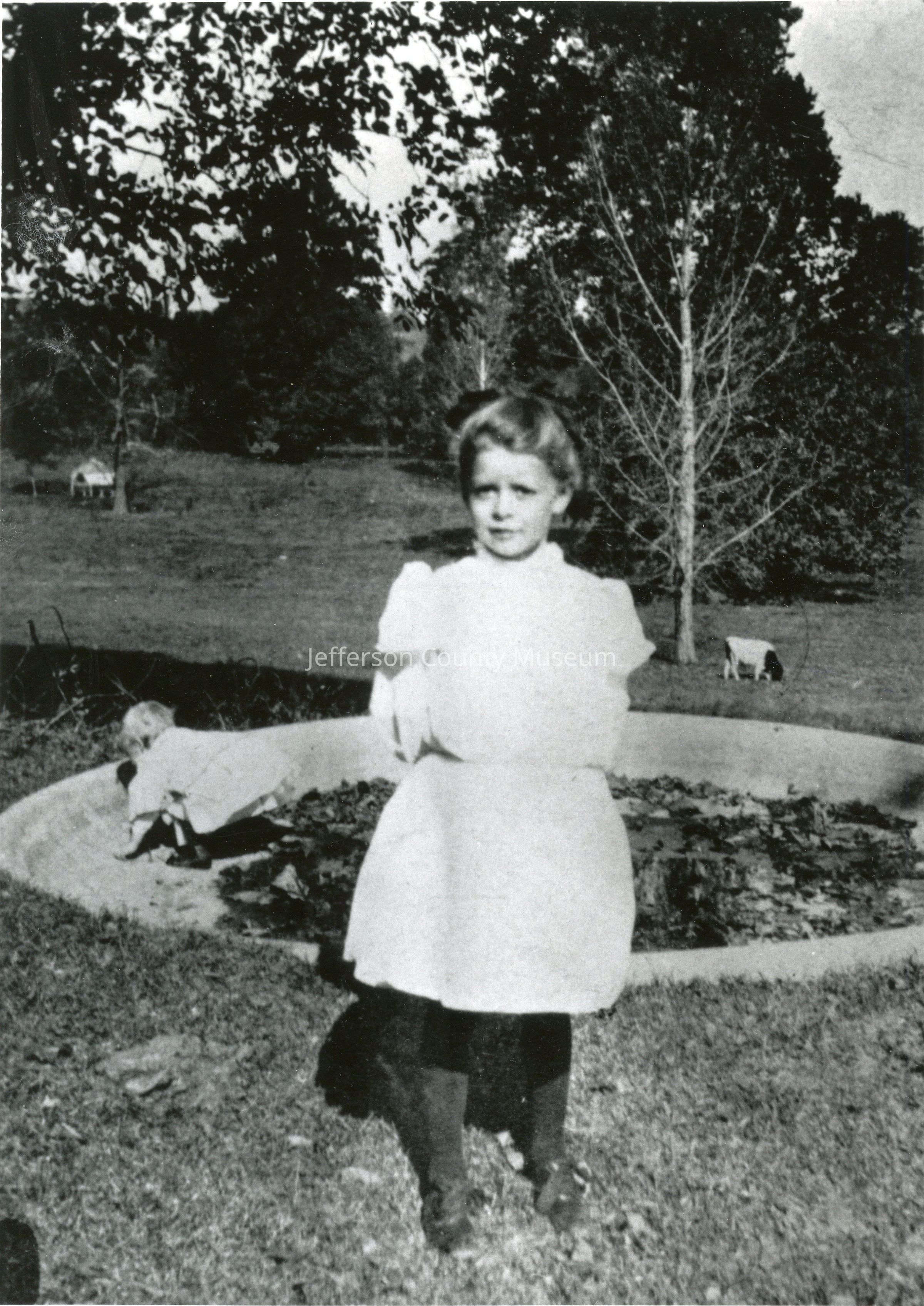 Virginia Cosy standing in front of a dry fountain. A small child is bending over in the fountain. Cow grazing to her right. Photo is glued to foamcore.Acquisition