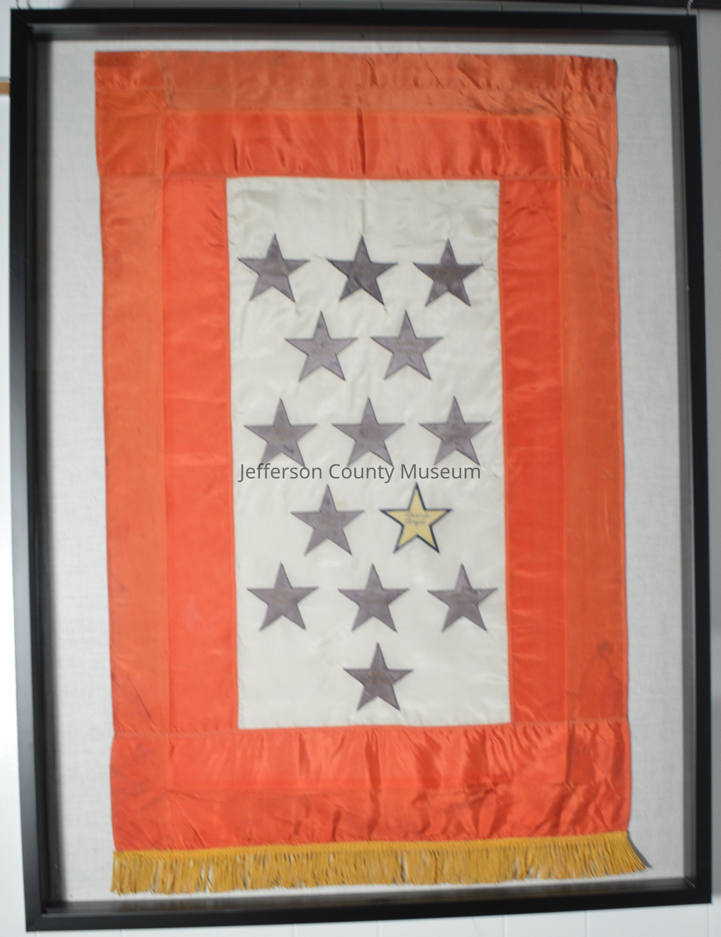 (B) Banner with white satin background, machine-stitched to red satin border. Gold fringe machine-stitched along bottom edge. Tag sewn into top right corner on back: "ARTCRAFT / MFG. CO. / GRAND RAPIDS, MICH.". One gold star with name in blue script, and thirteen blue stars with name in blue script machine-stitched to white background. Names on stars, top row (left to right): Alvin Bush, Boyd Clipp, Louise Kable. Second row: Nelson White, Delmar Hough. Third row: Charles Mason, John Mason, Mervin Rodrick. Fourth row: G. Bailey Boyd, Lewis Boyd (gold star). Fifth row: Lewis Kretzer, Paul Carroll, George Rouss. Bottom row: Arch Carroll.