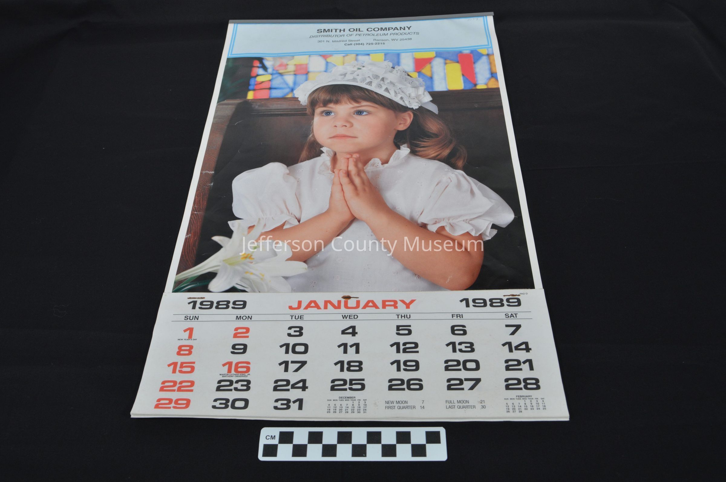 Hanging wall calender for 1989. Distributed by Smith Oil Company, 301 N. Mildred Street, Ranson, WV 25438. Phone: (304) 725-2215. Back has picture of young girl in church; pages for each month are stapled below picture, all months (January through December) are present.Acquisition
