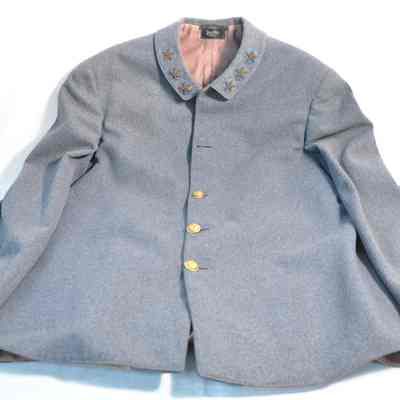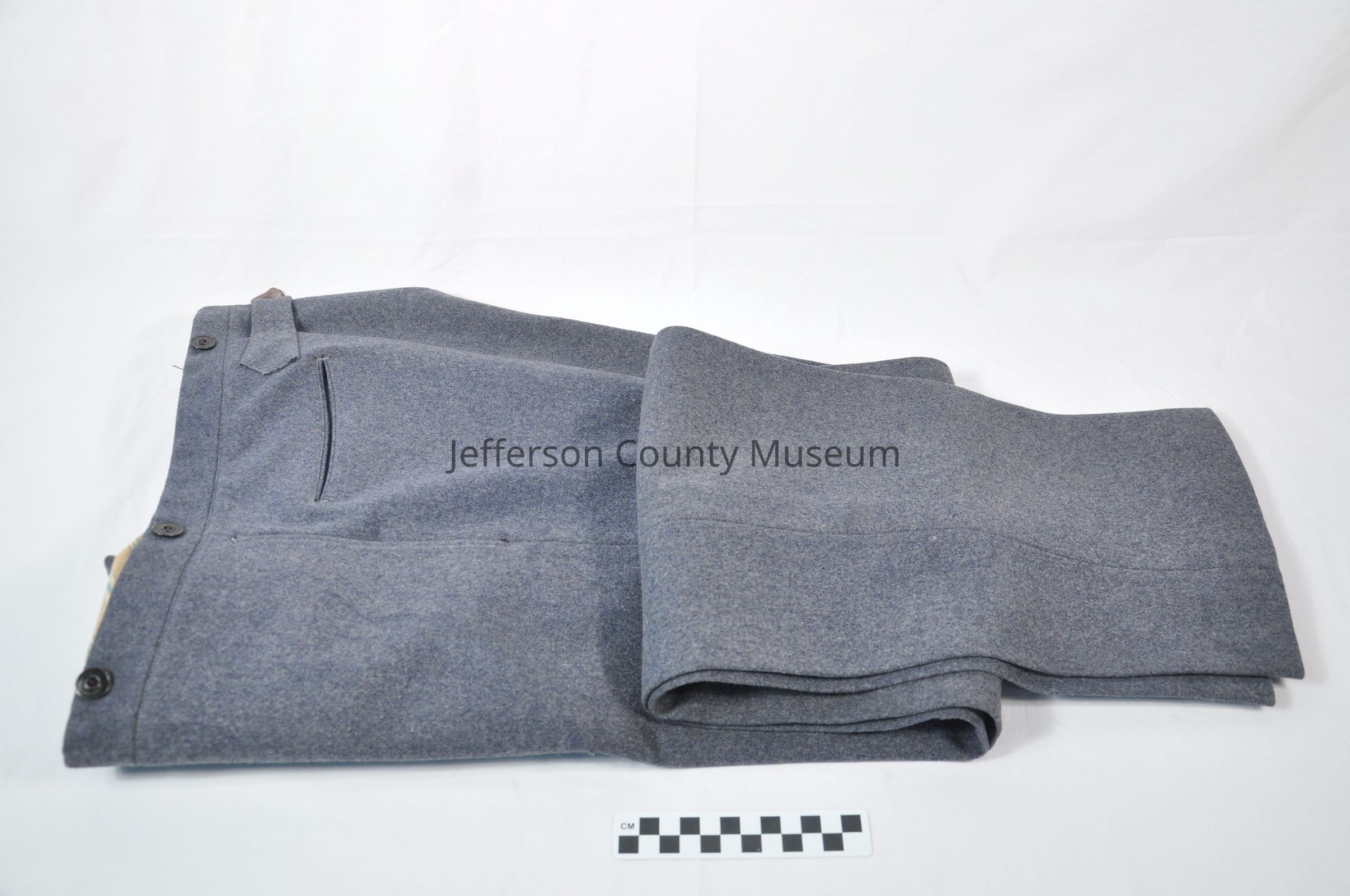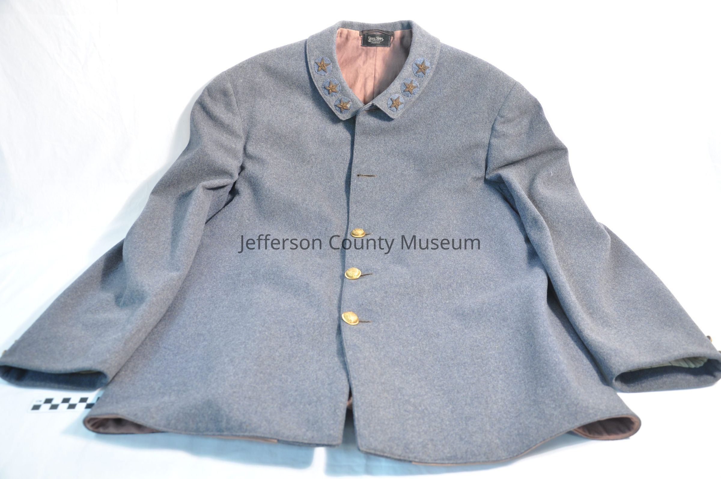 Confederate veteran uniform owned by Col. R. P. Chew. Blue-gray wool. Five buttons on front of jacket and two on each sleeve. Three colonel's stars on each lapel. Buttons have Confederate battle flag with "UCV 1861-65" around flag. Label on collar says "Levy Bros. LOUISVILLE". Trousers have small wool belt sewn to back with metal buckle.