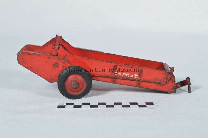 Red metal McCormick-Deering tractor spreader toy. Name is printed in white on each side. Rubber wheels.