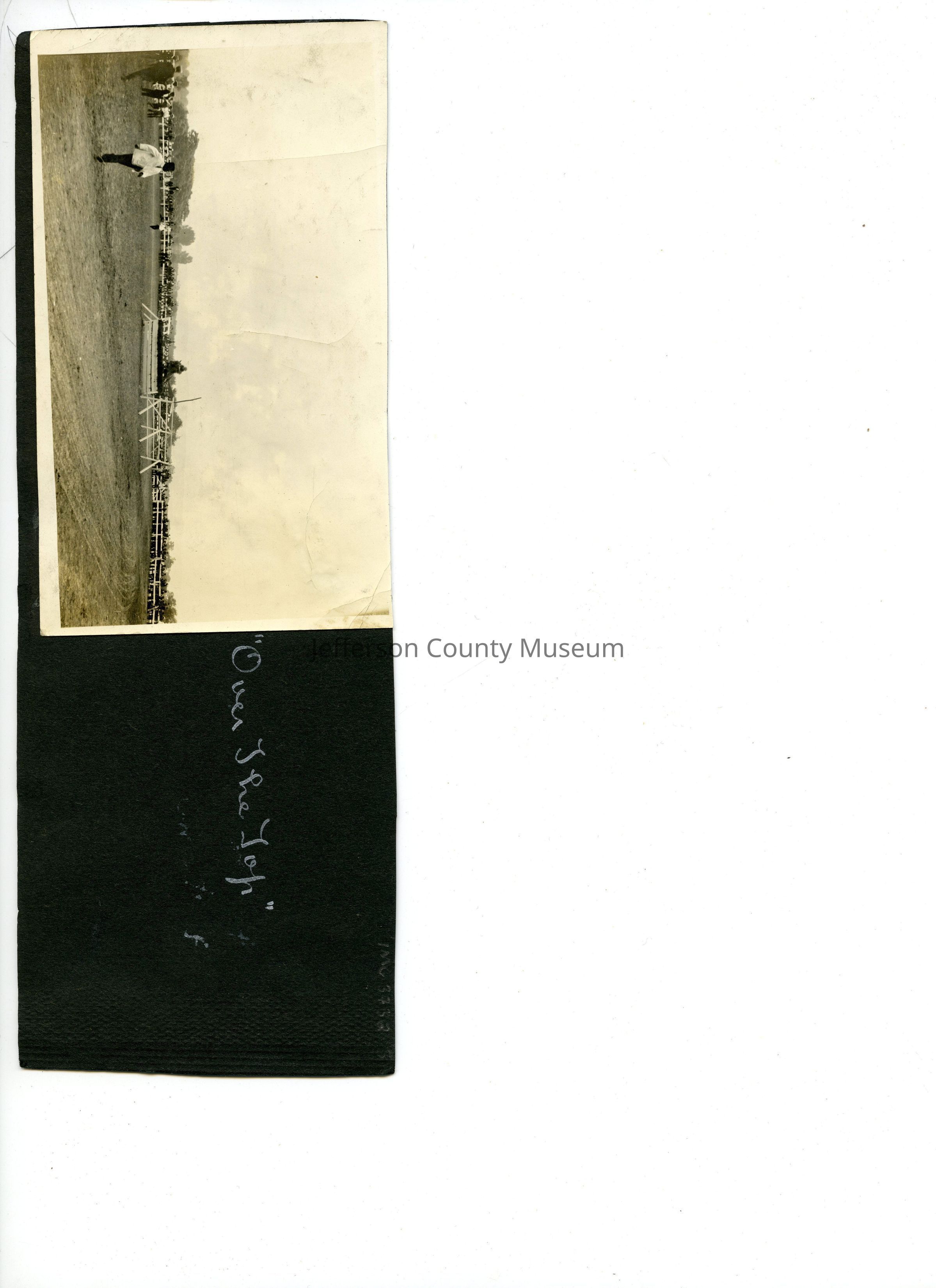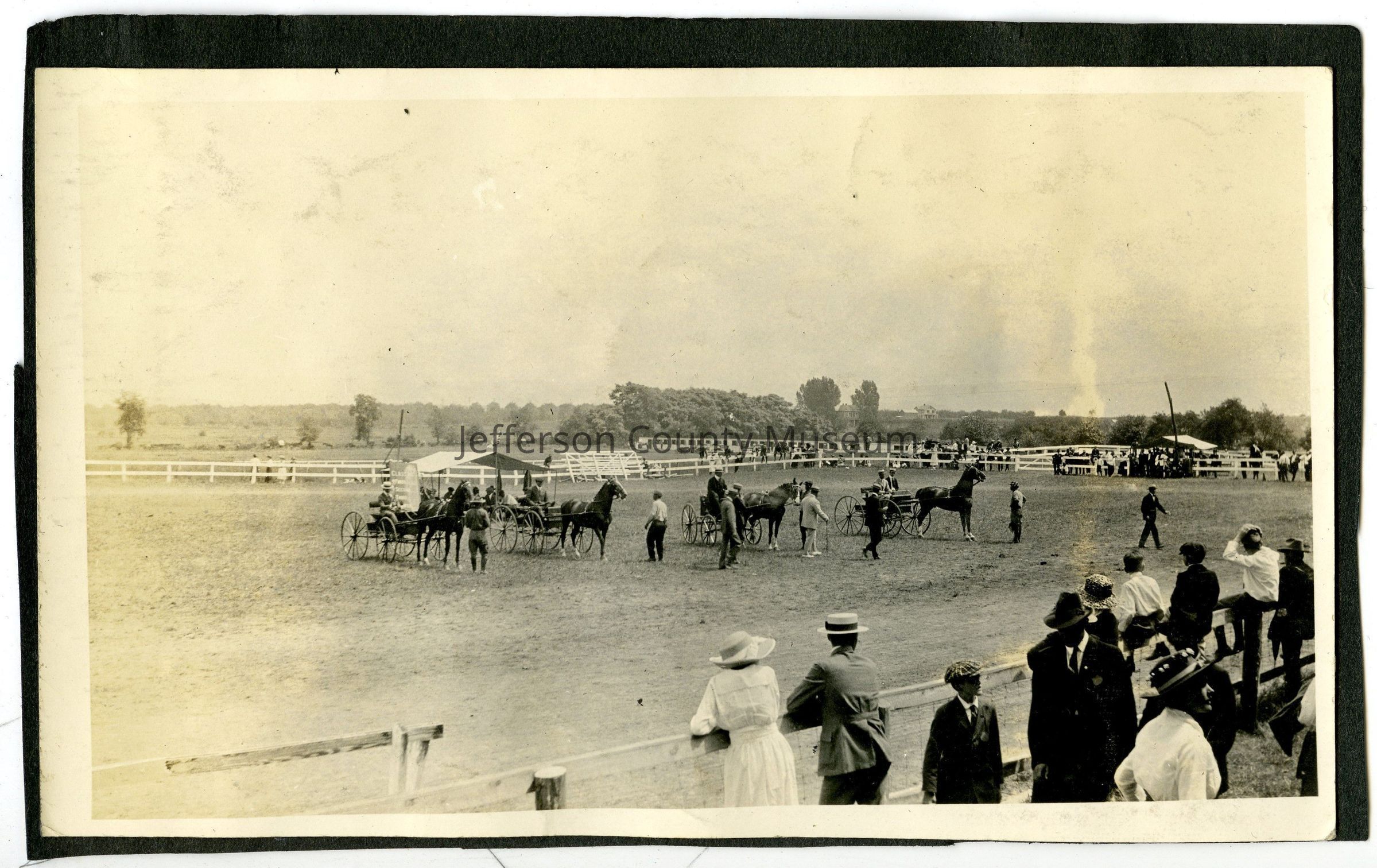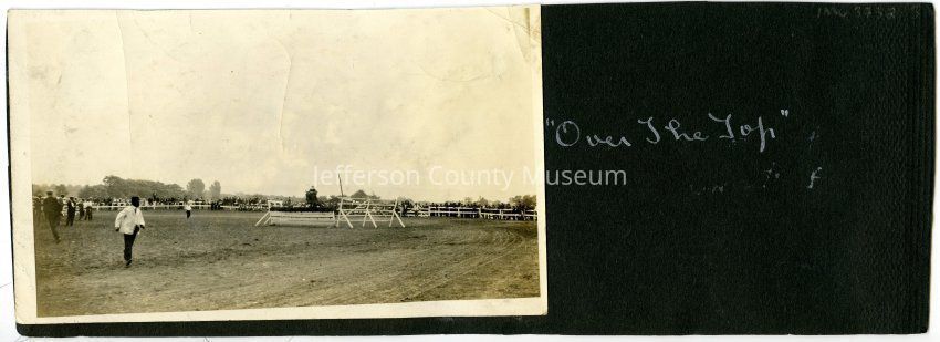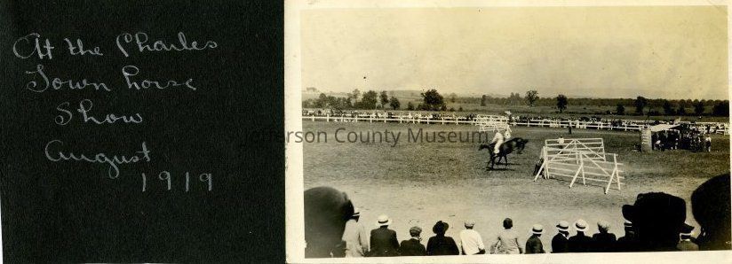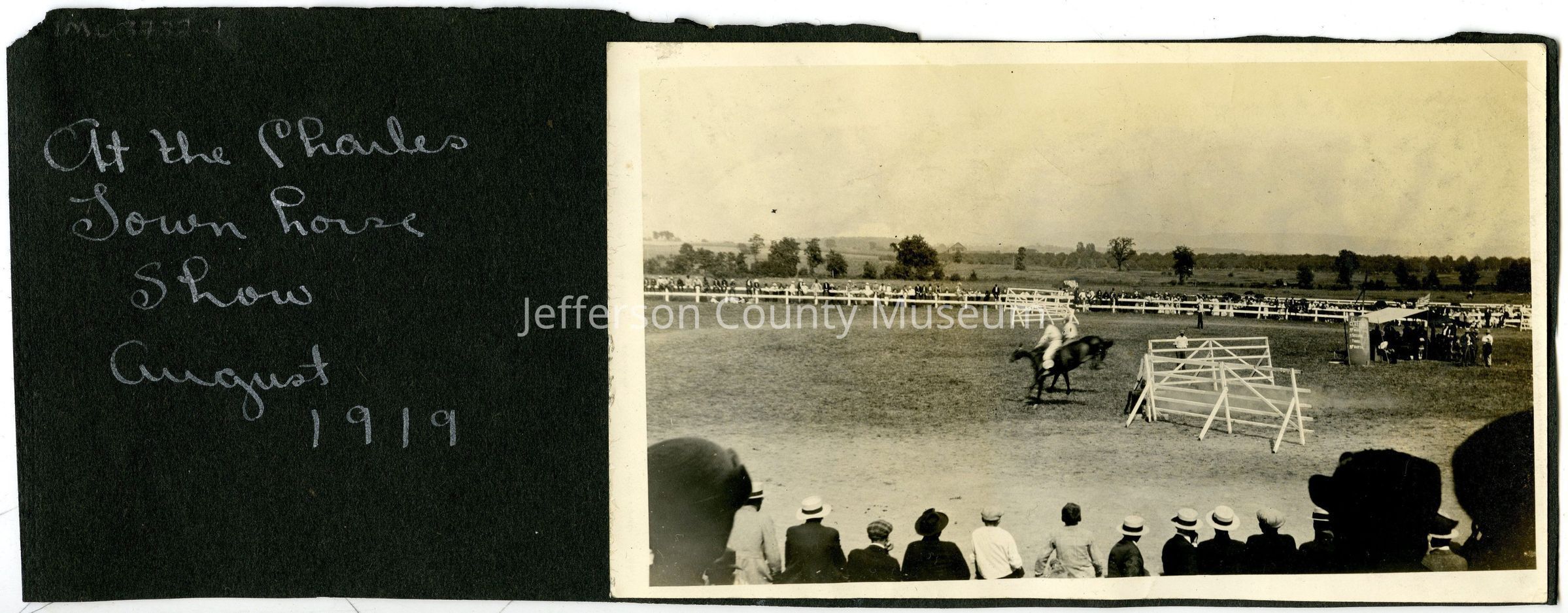 IMG3732-1: Horse and rider inside field. Crowd in foreground and background standing along fence. Written to the left of photo is: "At the Charles Town Race Show, August 1919."