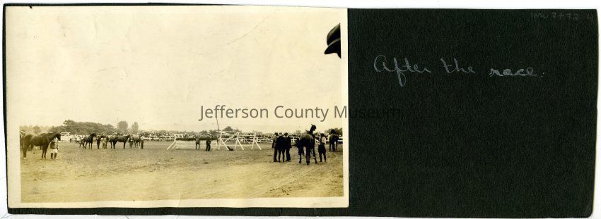IMG3732-4: Horses and men on field. Crowd standing along fence in background. Written to the right of the photo is: "After the race."