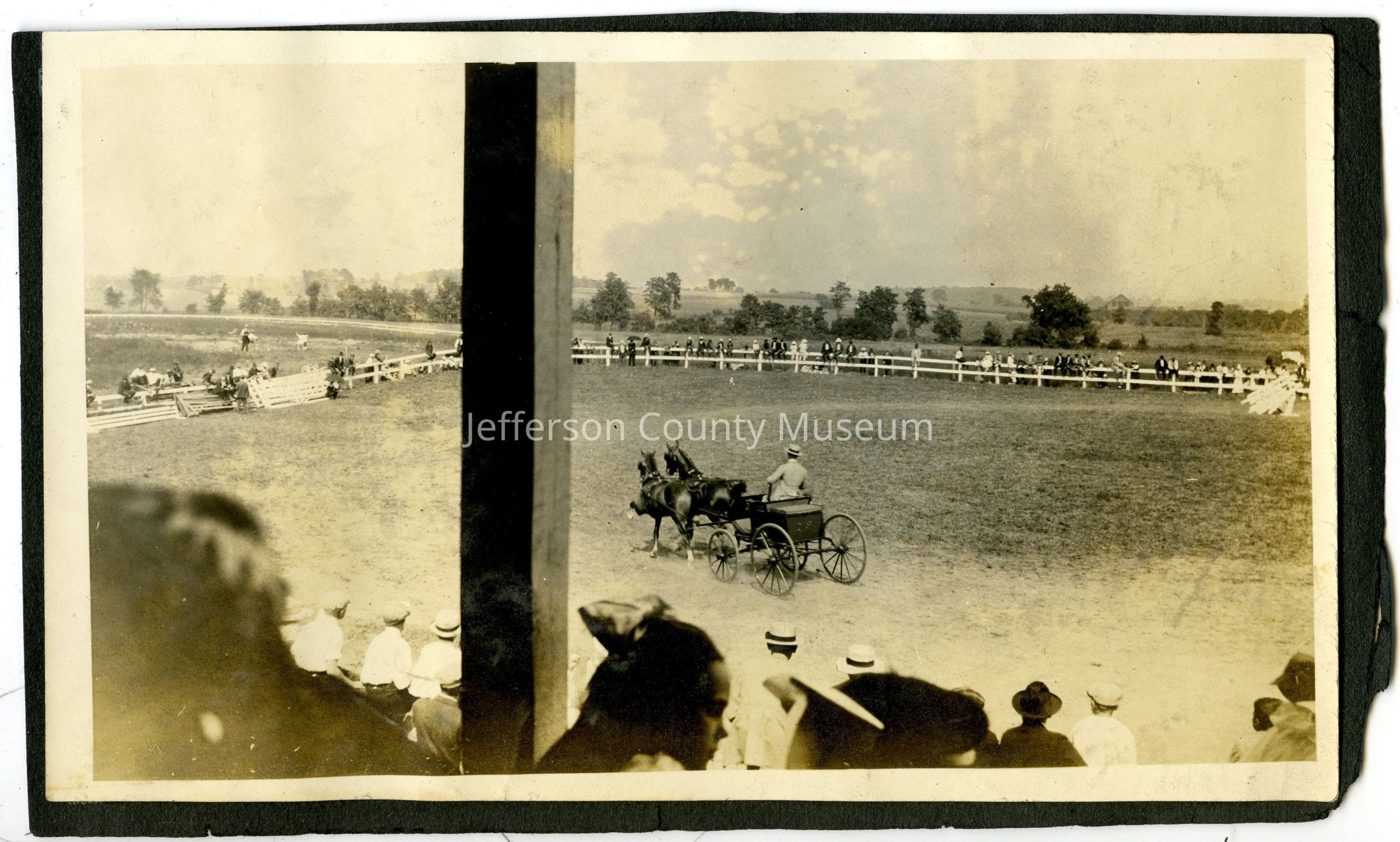 IMG3732-6: Carriage with two horses and rider inside field. Crowd in foreground in stands and in background standing along fence. On back of photo is: "Come on doggie, Oh! You Sweet ..."Acquisition