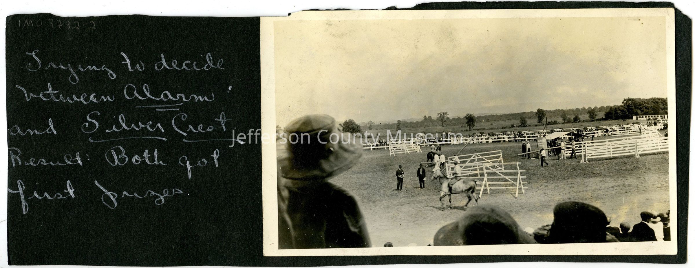 IMG3732-2: Horses and riders inside field. Crowd in foreground in stands and background standing along fence. Written to the left of the photo is: "Trying to decide between Alarm and Silver Crest. Result: Both got first prizes."