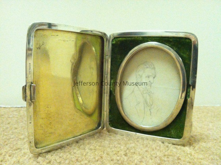 Pencil sketch drawing of Joel Osburn from 1850; attributed to Adeline (Adaline) Osburn Palmer; set in an oval frame lined with green velvet; in sterling silver rectangular hinged case. On lower left corner of silver case is marked "G6312". Also marked "STERLING" & "2".Acquisition