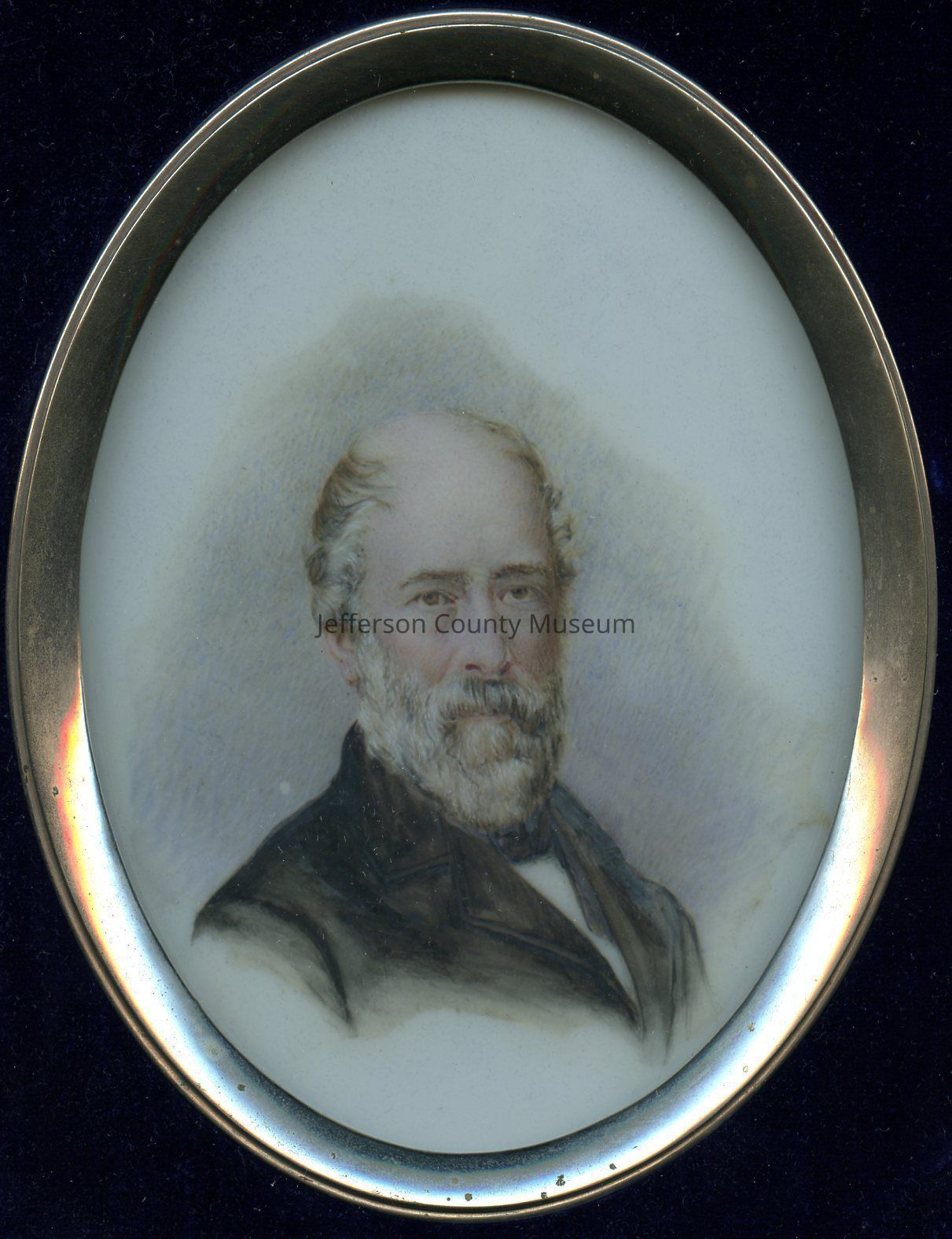 John Pendleton Kennedy shown with beard and black frock coat. Painting on porcelain, in blue velvet frame with blue velvet shutters that close over picture.Acquisition