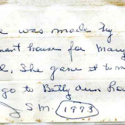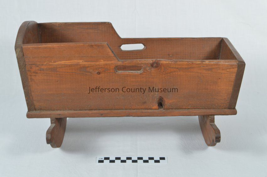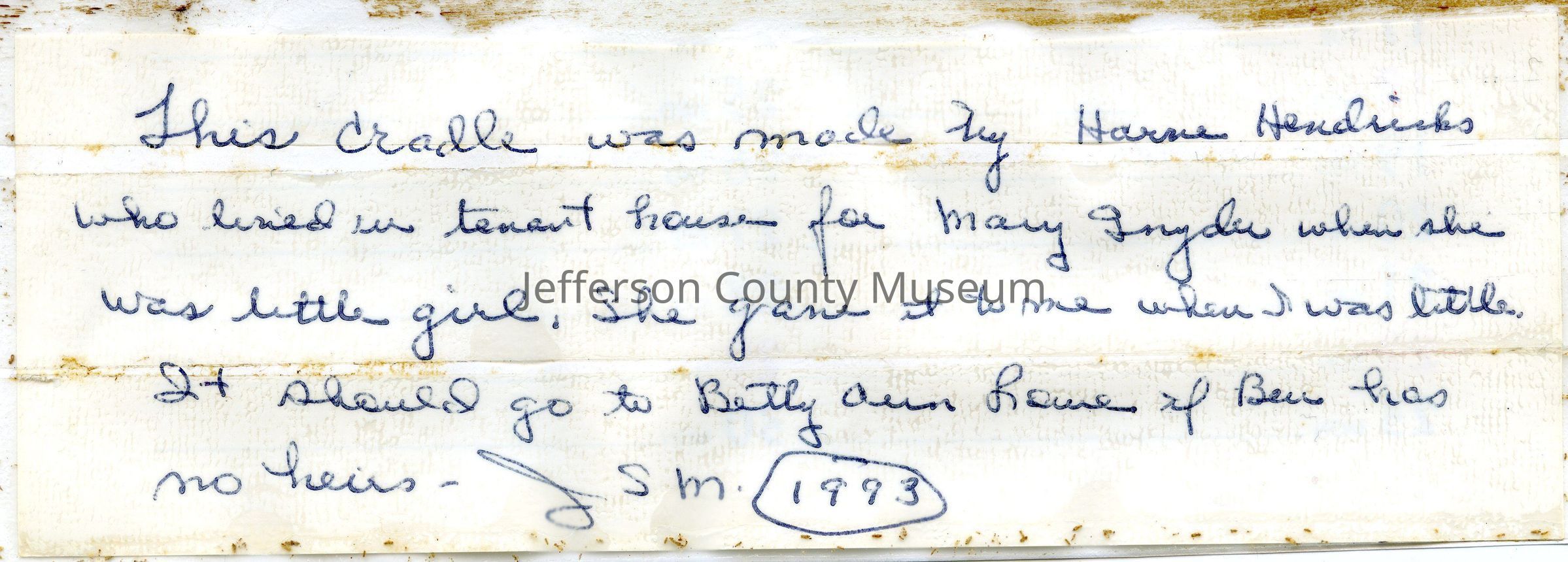Wooden doll cradle, handmade by Harve or Harne (?) Hendricks for Mary Snyder Saum (aunt of Jane Snyder Miller) when she was a little girl. Jane Snyder Miller's handwritten note about the cradle is with the cradle.Acquisition