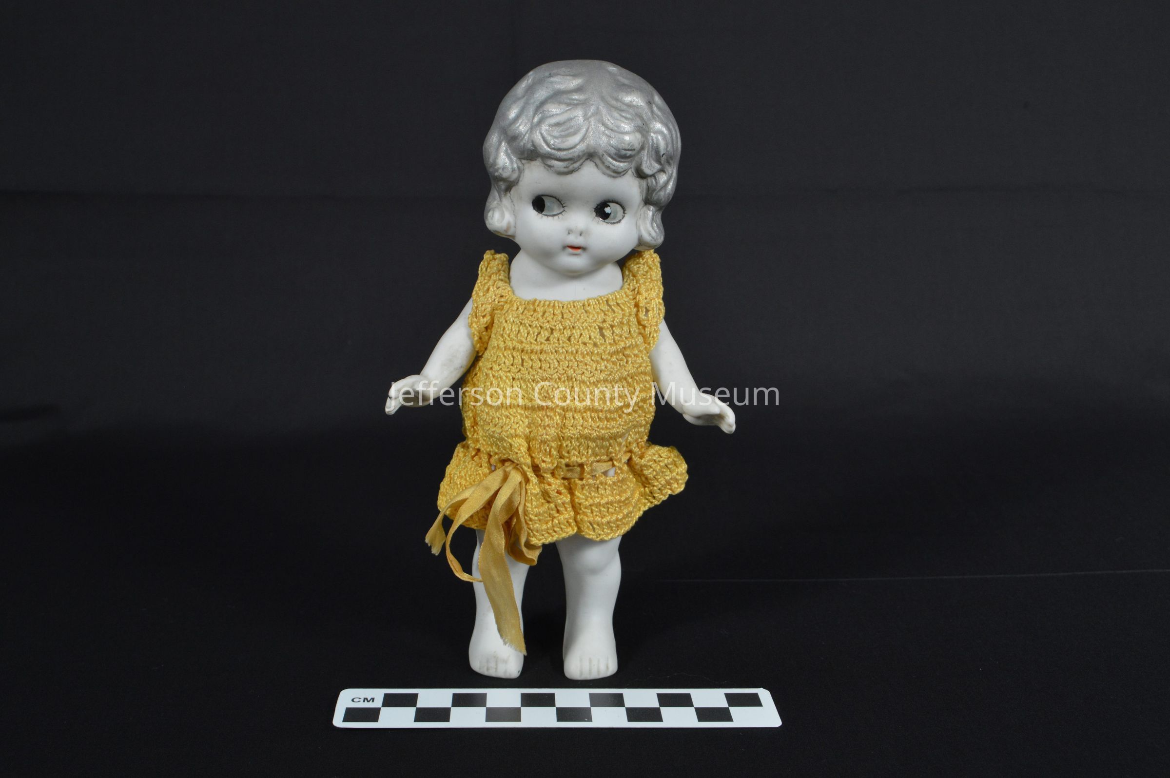 Porcelain doll with moveable arms. Hair is molded; doll's lips, eyes, and hair are painted. Wearing a yellow crocheted dress with flared skirt.Acquisition