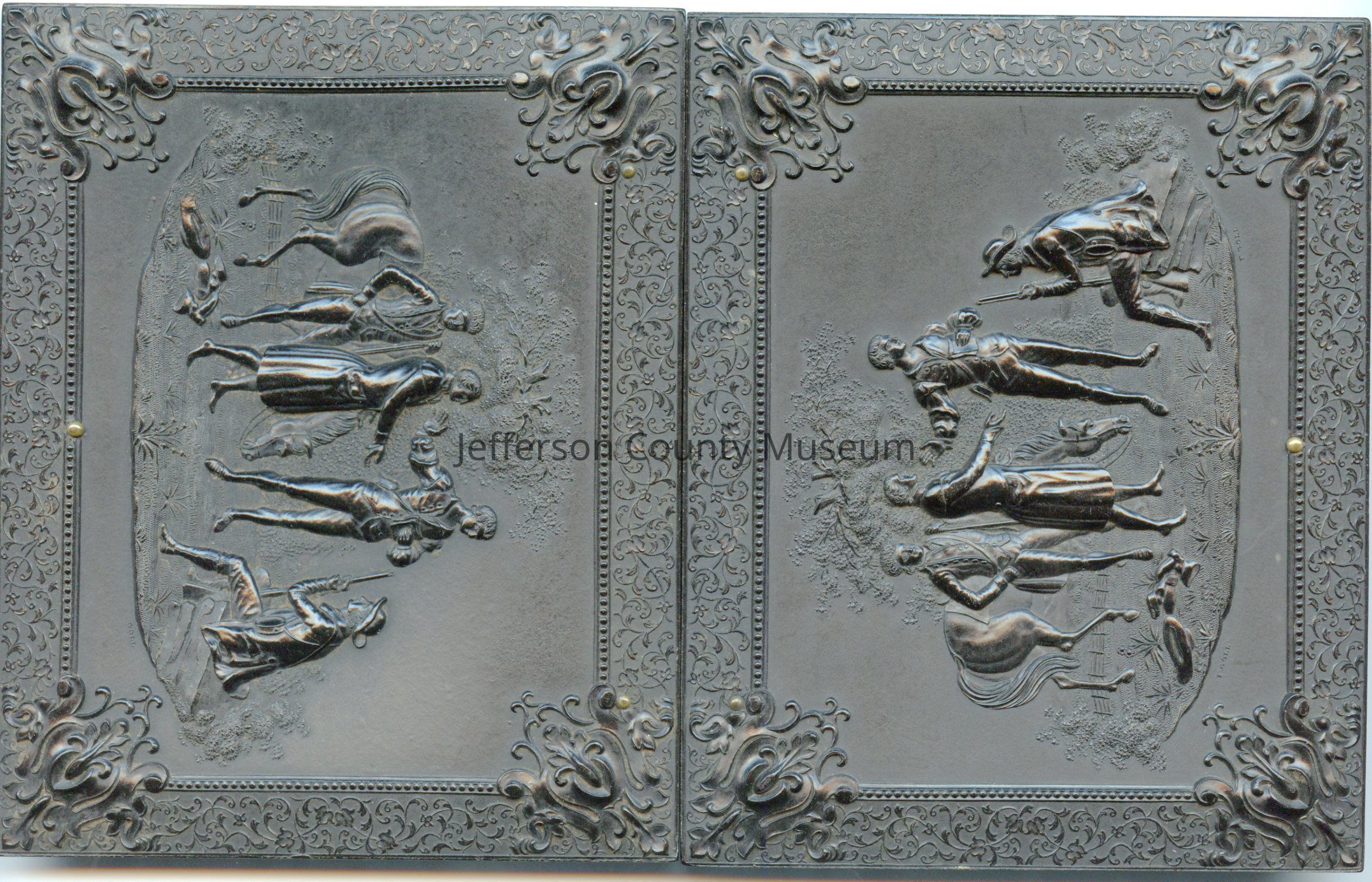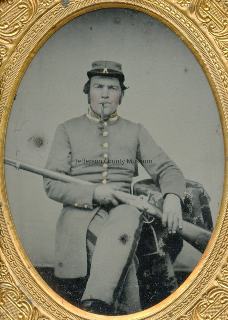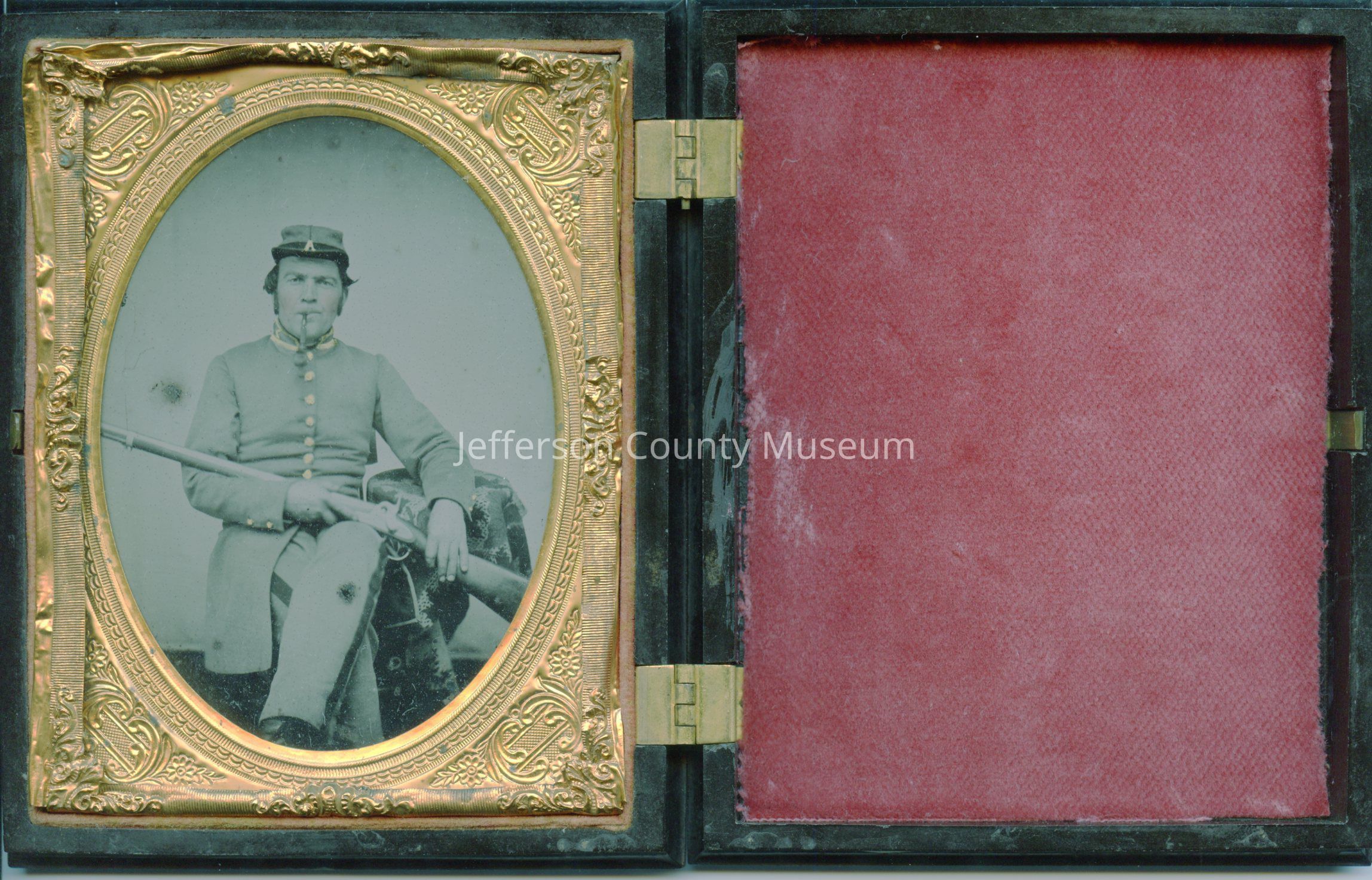 John F. Blessing in his Confederate uniform. He is seated, with pipe in mouth, and has his kepi, which has "A" on it for Company A of the 2nd Virginia Infantry. He is holding his rifle across his right arm with his left hand on the stock. His left leg is crossed over his right. Closeable frame is black composite material. Both sides on outside show a scene with three men standing, one seated, a horse behind them and a tree in background. One man is in long coat and barefoot with his boots and hat to the side. Seated man is holding a rifle with the butt on the ground.