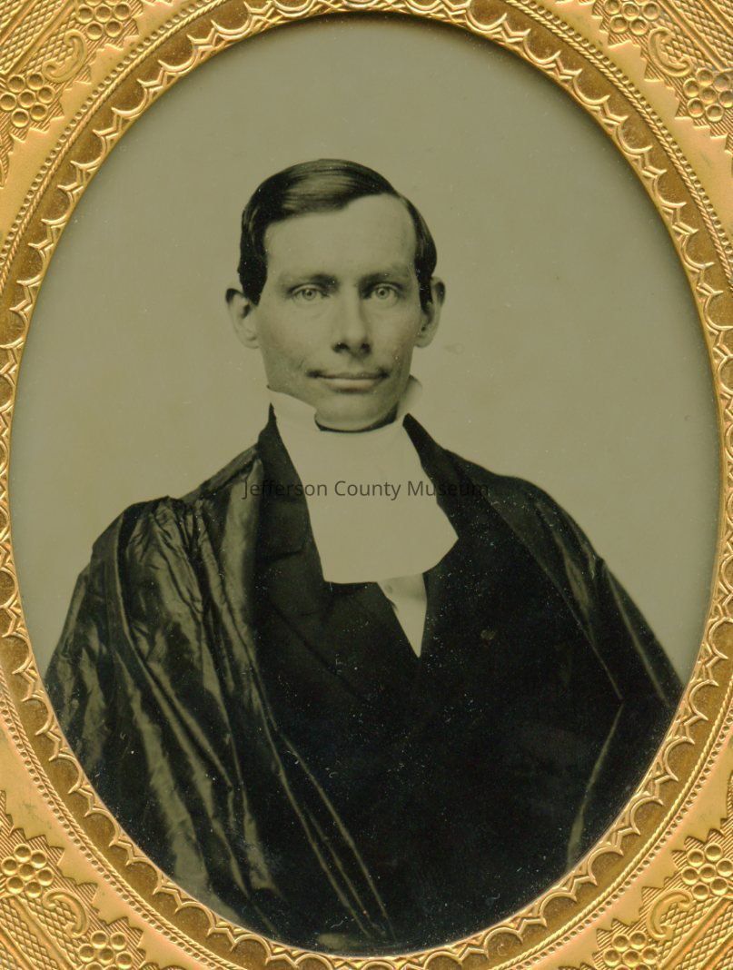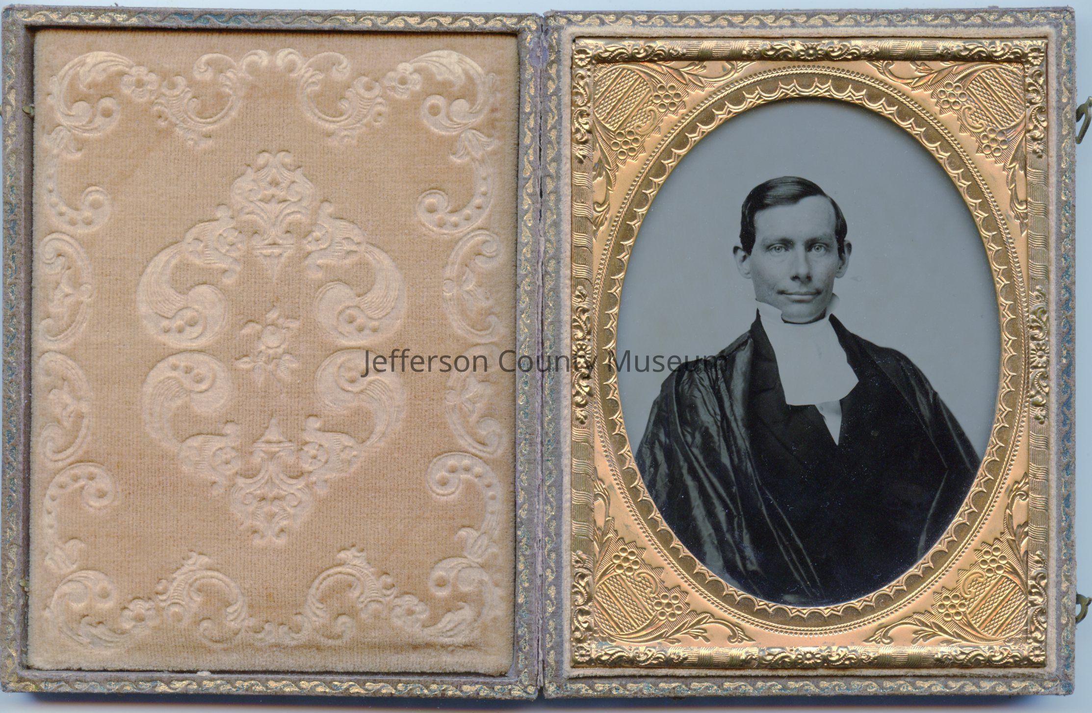 Portrait of the Rev. Charles Ambler wearing clerical robe and white collar, Rector of Zion Episcopal Church from 1852 to 1866. In tooled leather case. An embossed metal frame encloses picture. Inside front cover is lined in rust colored velvet.Acquisition
