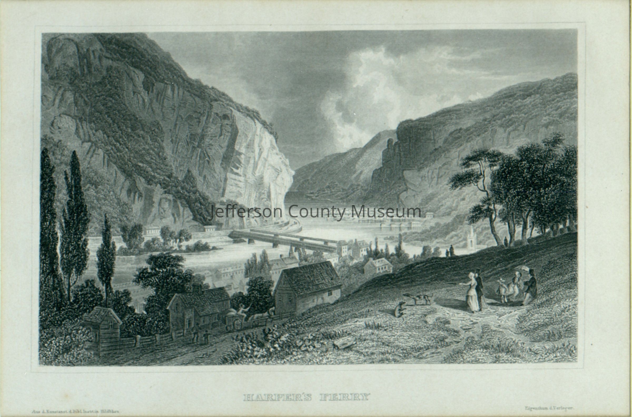 Harpers Ferry circa mid 19th century. At bottom center " HARPER'S FERRY ". At lower left corner " Aus. d. Kunstanst .d. Bibl. Instutin. Hildbhsn " At bottom right corner " Eigenthum d. Verleger "Acquisition