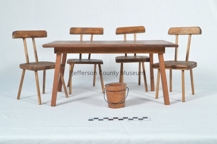 Wooden table, four chairs, and bucket (with metal bail) made by Walter Smallwood, self-taught woodworker, from Mechanicstown.
