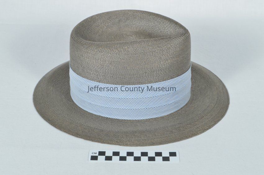 Gray hat (fedora style) with blue and white checked band. Size 7. On inside of leather band are written: "Stetson Medalist, John B. Stetson Company" and "ADAM LINK & SONS / CHARLES TOWN, W. VA." Adam Link Clothier, followed by Adam Link & Sons, was on the northwest corner of North Charles and West Washington Streets in Charles Town. Streetscape photo (IMG449) looking east on Washington Street shows Link's store on the left side of the photo. In business there in the 1930s, 1940s, and closed in 1955. The Silco Store replaced Link's at that location in 1956.Acquisition