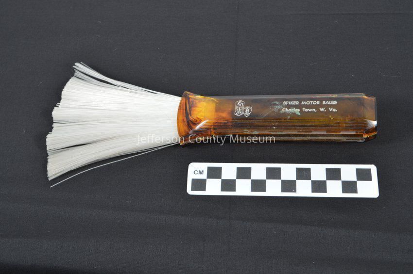 Retractable nylon brush, SPIKE MOTOR SALES, CHARLES TOWN, W. VA. written on brown handle. Dodge and Plymouth logos on handle. Complimentary customer gift from Spiker Motor Sales, Charles Town, W. Va. According to JCM historian, Spiker Motor Sales operated in 1950s and 1960s on East Washington Street/Route 340 North. Had Chrysler, Plymouth, Dodge franchises.Acquisition