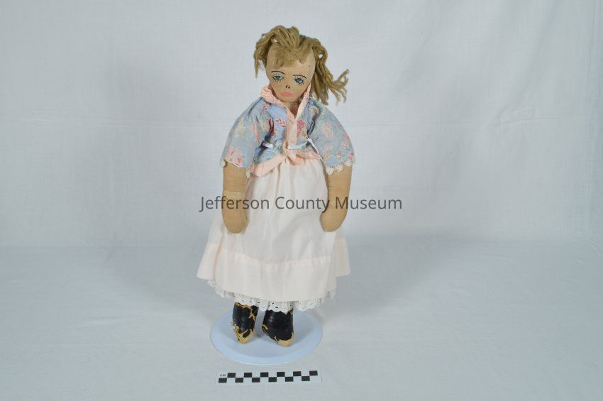 Hand-made fabric doll with blue eyes, eyelashes, eyebrows, nose, and mouth of stitched thread. Doll has brown yarn for hair that is stitched to her head. Wearing hand-stitched blue floral top with pink silk lining and white lace on the end of the sleeves; white pants and petticoat with ruffled white lace on ends and tied with pink ribbons around the waist; pink skirt tied with pink ribbon around the waist. Doll has black shoes made from thin black material overtop of what may be a burlap fabric. The black material is peeled in some areas. Made by Jen Elliott, who lived on Mildred Street in Charles Town, in 1942.Acquisition