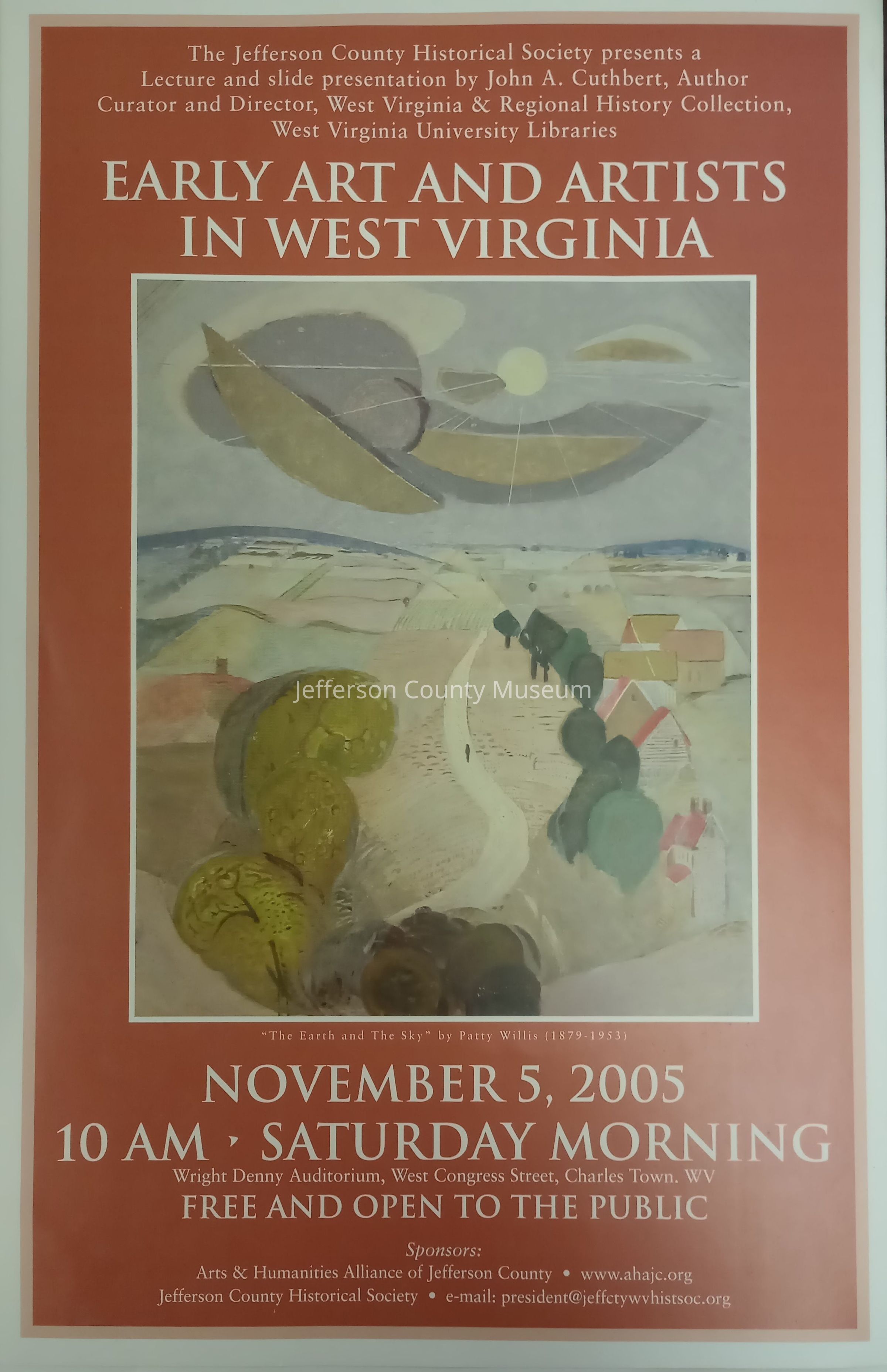 Poster advertising for the "Early Art and Artists in West Virginia" art show at Wright Denny auditorium. Poster features the painting "The Earth and the Sky" by Patty Willis. The art show was sponsored by the Arts & Humanities Alliance of Jefferson County and the Jefferson County Historical Society, and was accompanied by a lecture and slideshow by John A. Cuthbert, who was then Curator and Director of the West Virginia & Regional History Collection at WVU Libraries.Acquisition