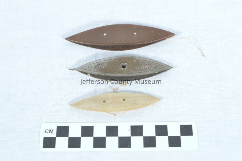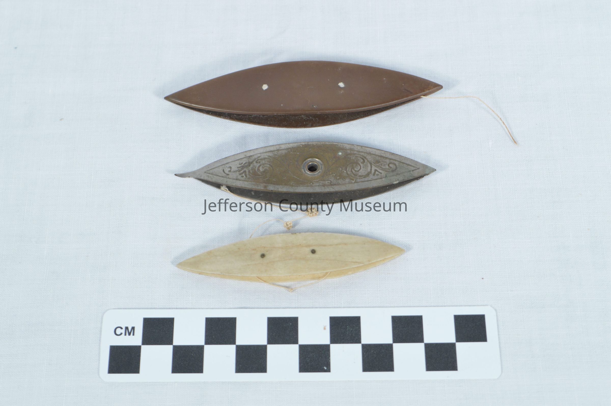 (c) Cream-colored plastic shuttle with cream-colored string wrapped around the middle