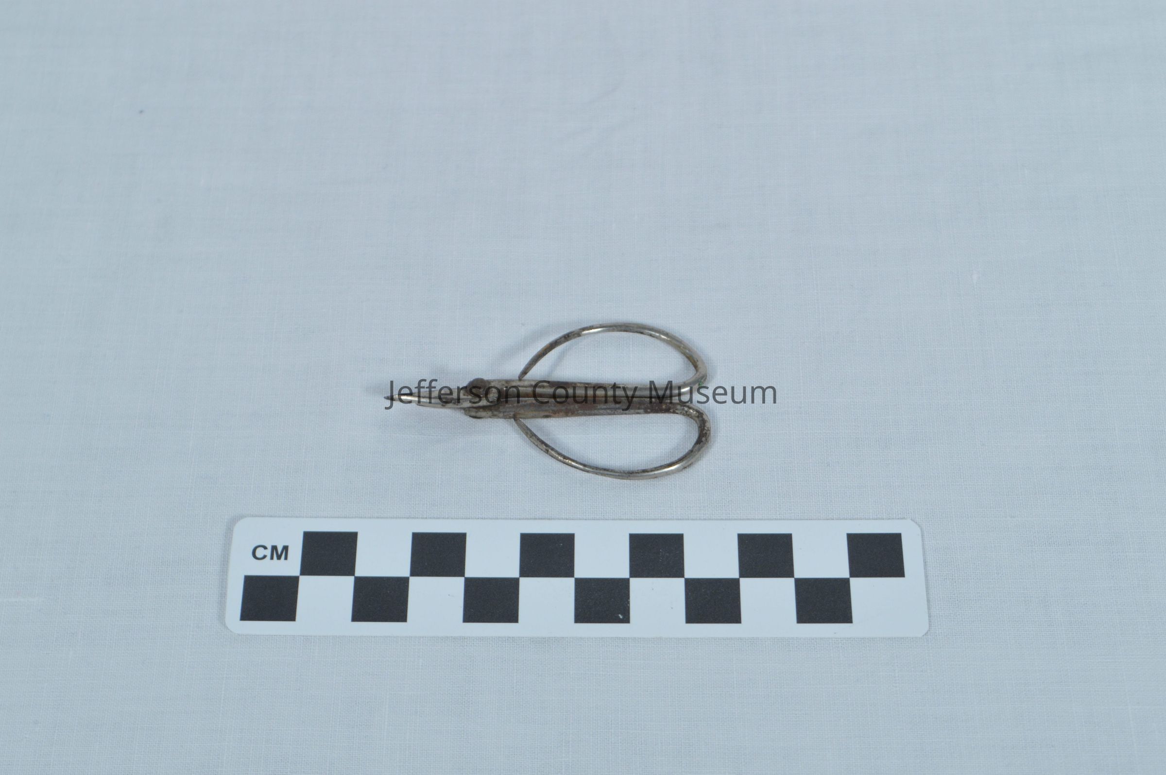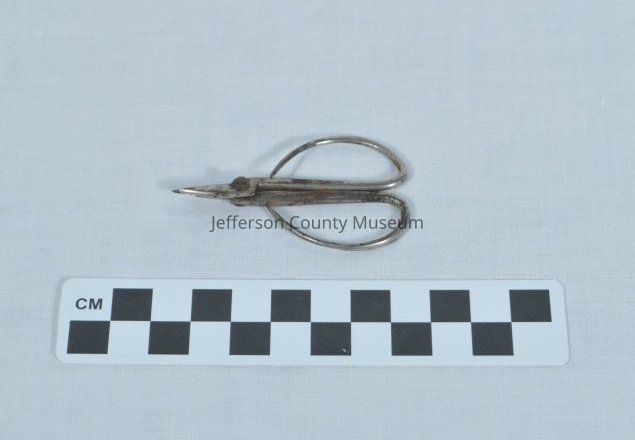Small metal hand scissors. MADE IN CHINA likely written on handle, but only IN CHINA is visible. CHANC is also written on handle, but remaining letters are illegible.