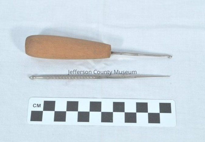 Part of a collection of sewing, crocheting, tatting, and leatherworking tools.Acquisition