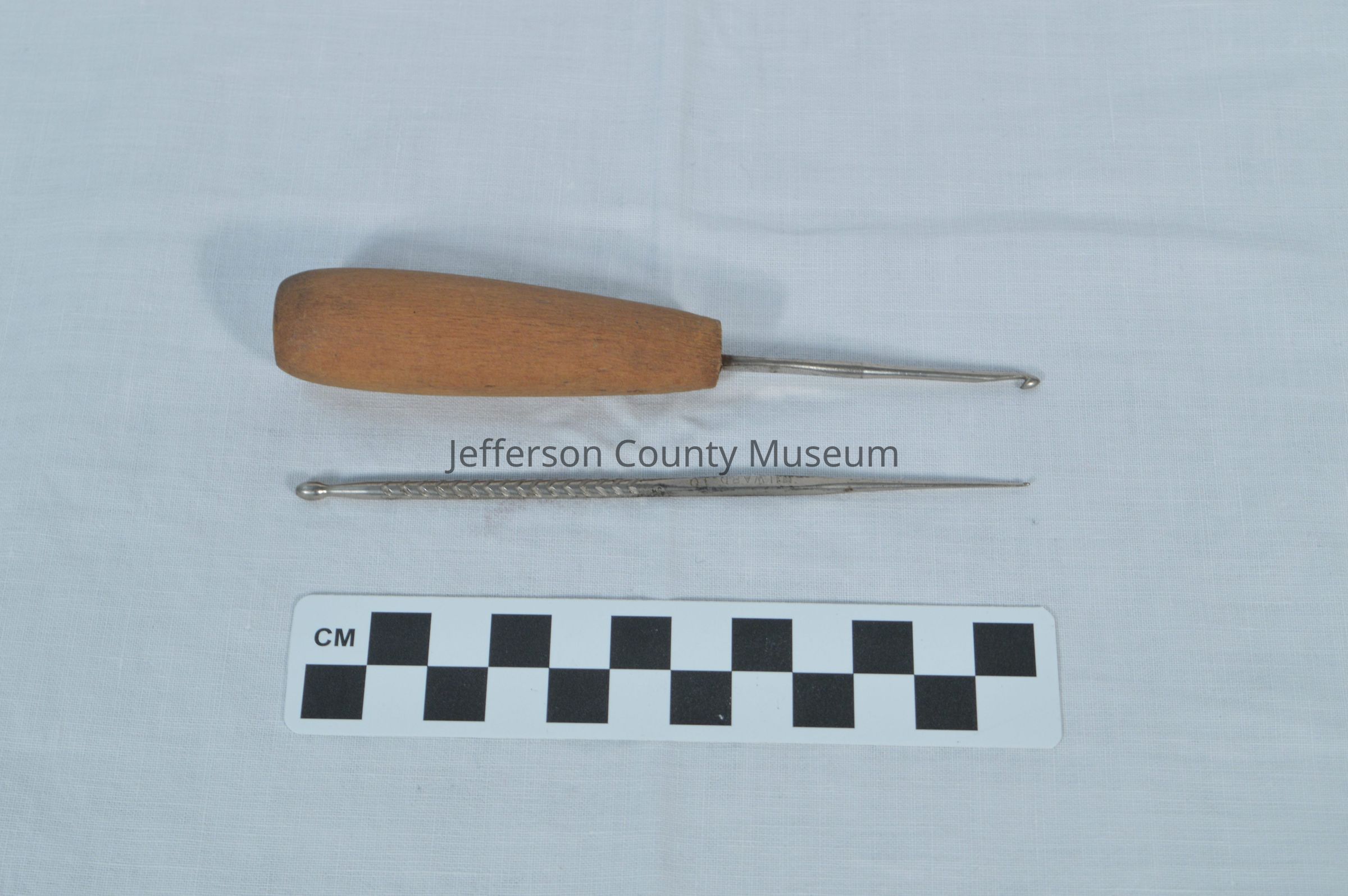 (b) Metal crochet hook with wooden handle