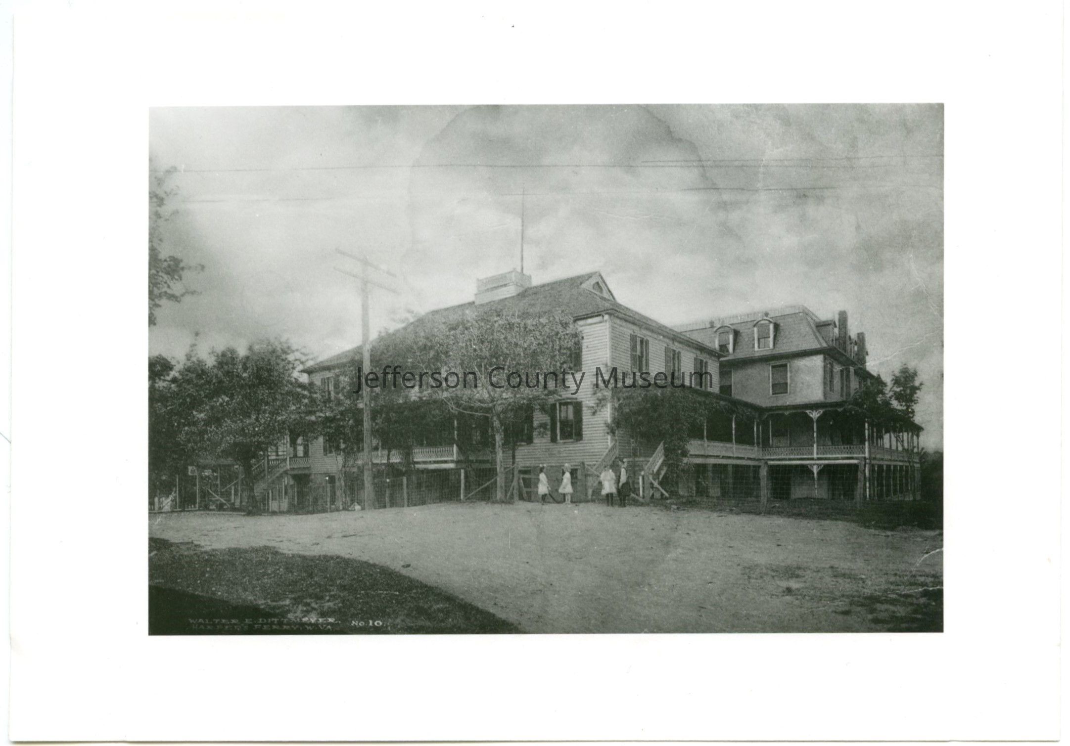 Four people standing in front of Hilltop House. At bottom left of photograph is "Walter E. Dittmeyer, Harpers Ferry, W. Va., No. 10." Written at lower right of the paper holding the photo is "Courtesy of Miss Charlotte Lovett, July 1968." Charlotte Lovett was the daughter of Thomas and Lavinia Lovett, African American builders and operators of Hilltop House.