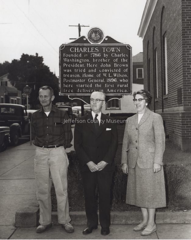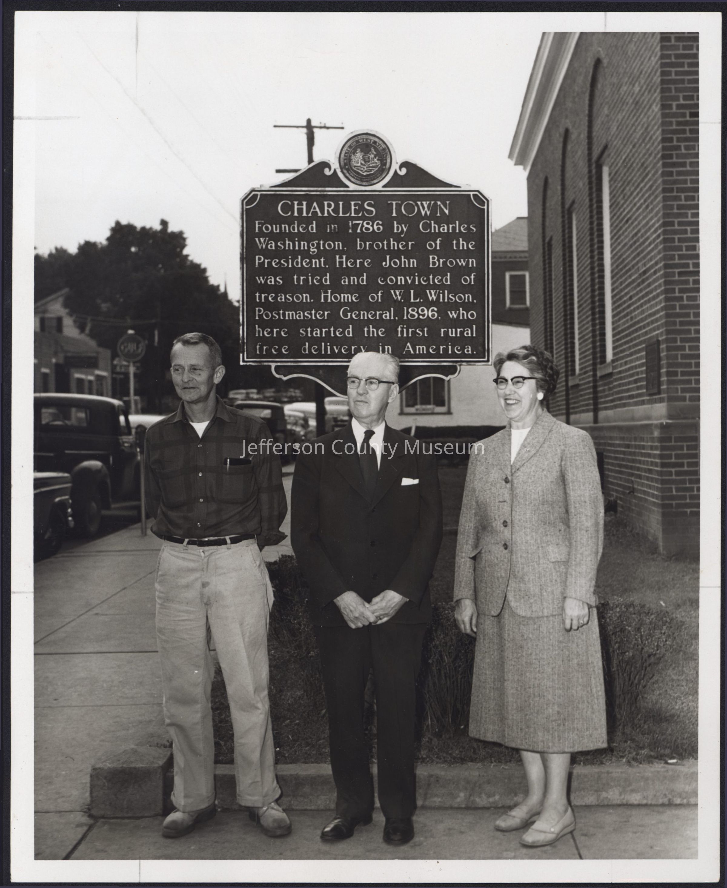 (Left to right) John A. Smith, Jr., Melvin T. Strider (one of the first rural carriers in 1896), and Vesta Watters Jones in front of the historic marker at the Charles Town Post Office at the southwest corner of George and Washington Streets in Charles Town, date unknown. (IMG3226)