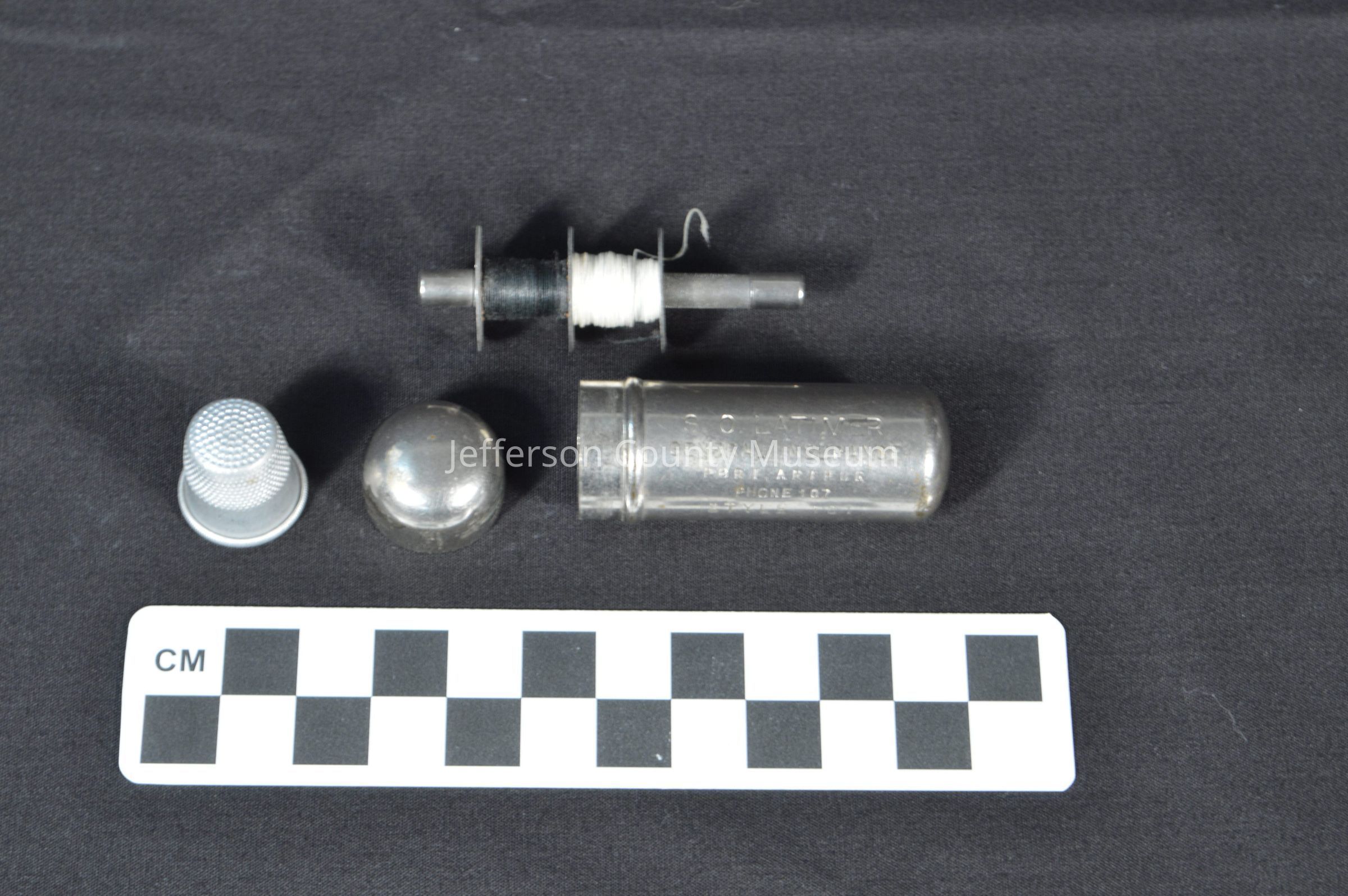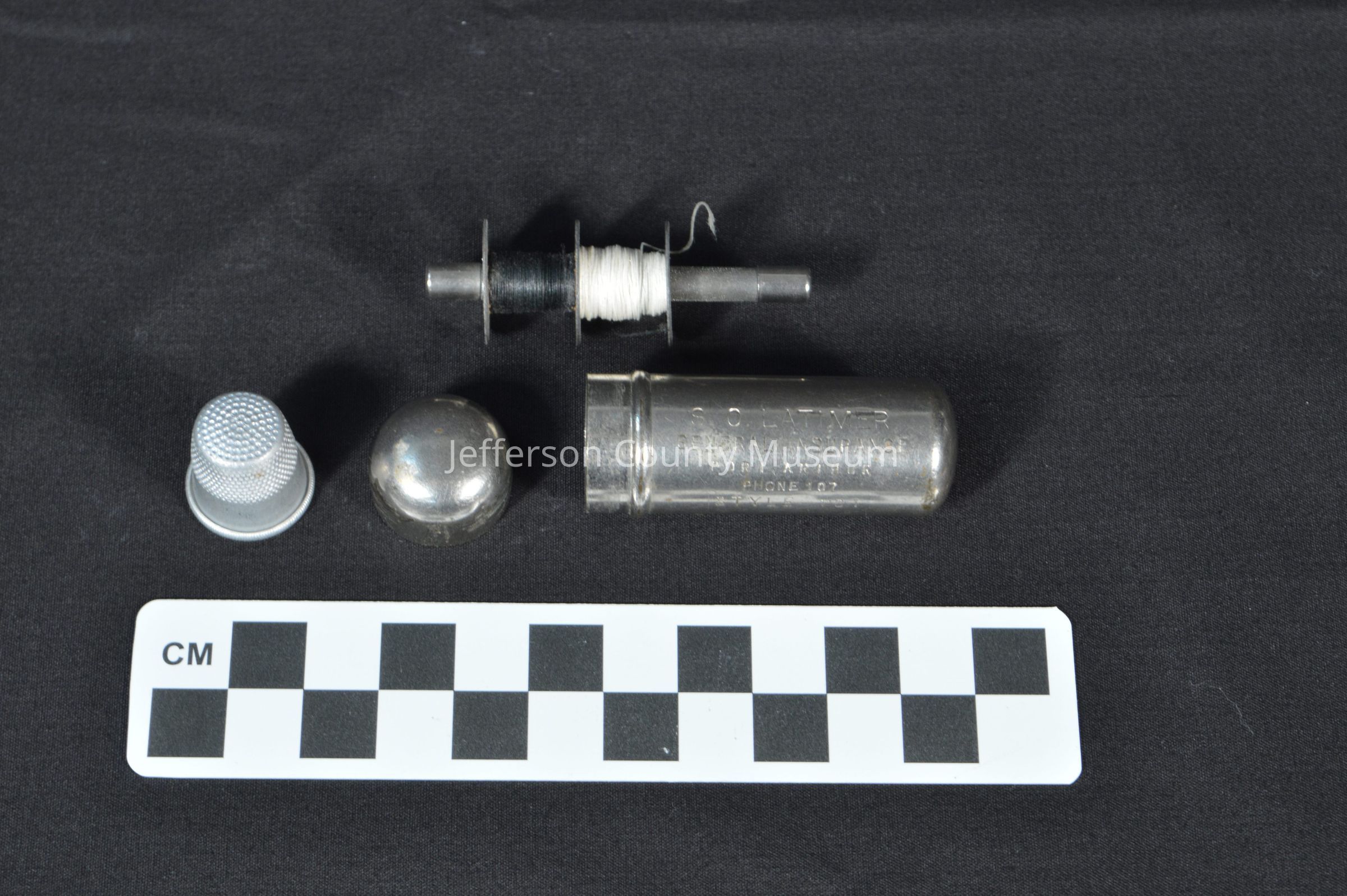 (b) Silver bobbin holder with engraving: S.O. LATIMER GENERAL INSURANCE PORT ARTHUR PHONE 107 STYLE 101.