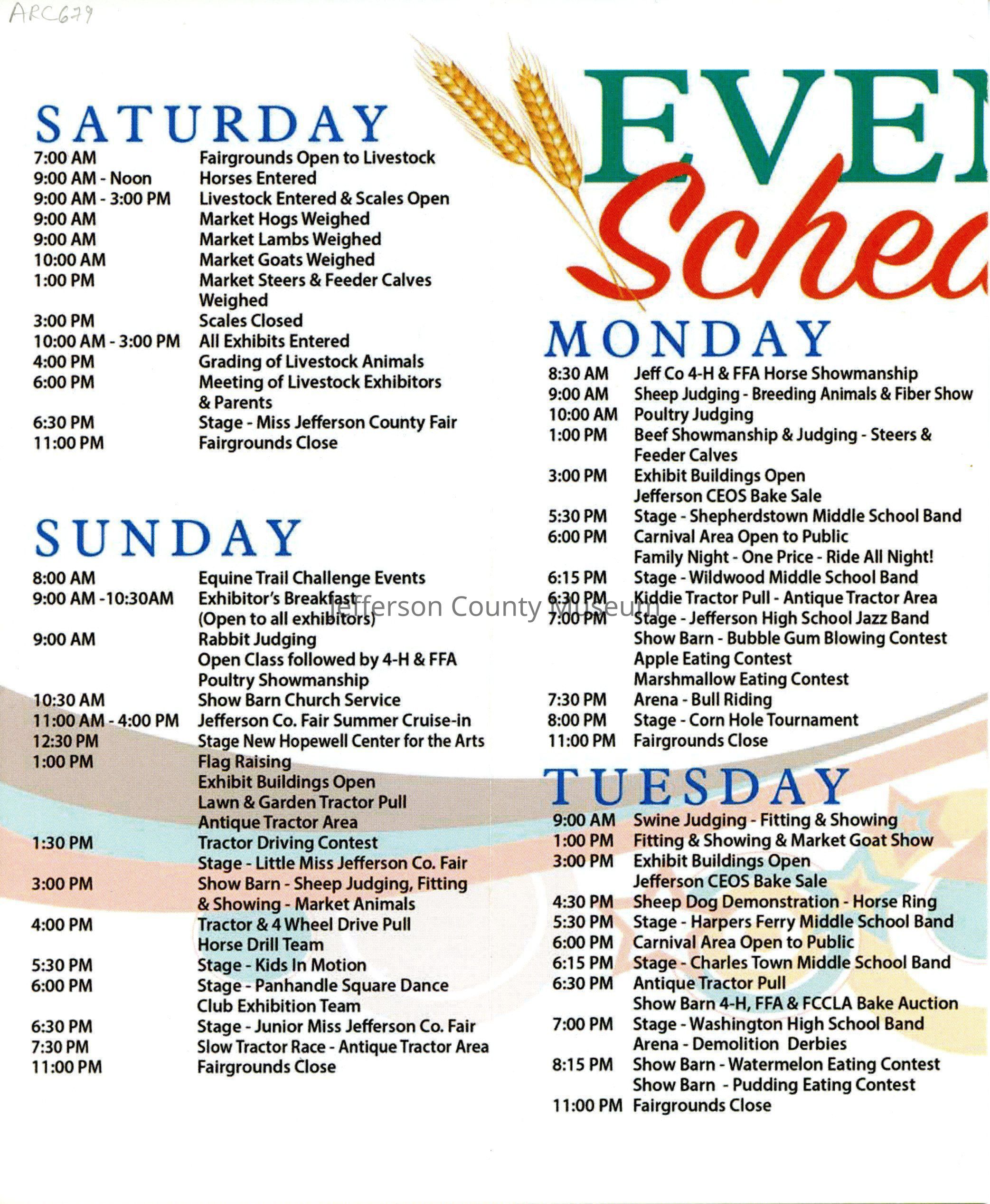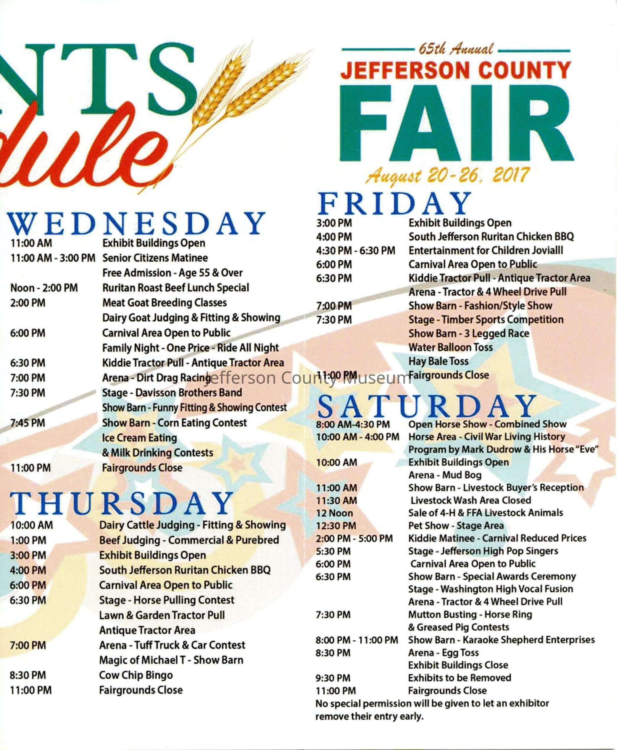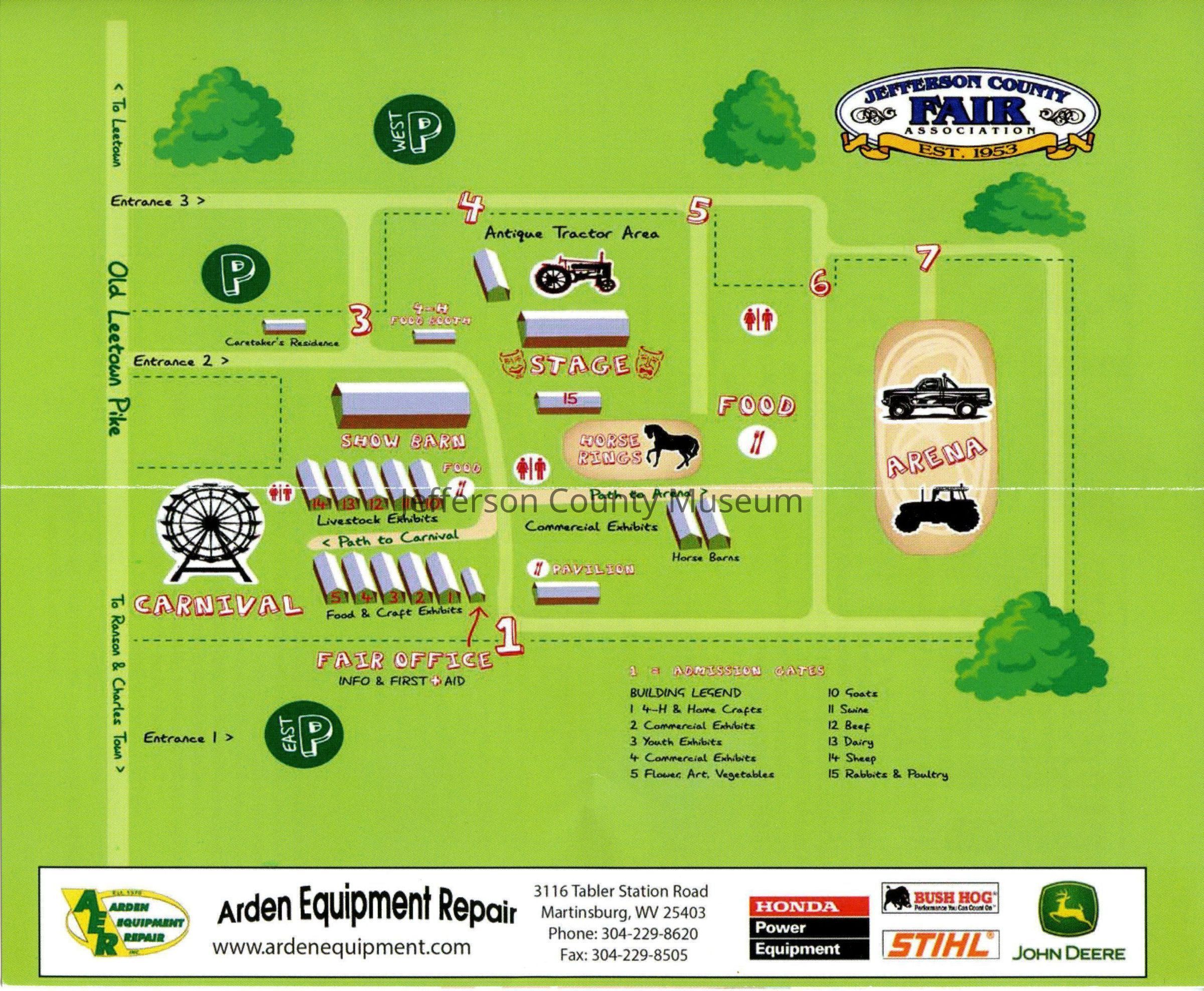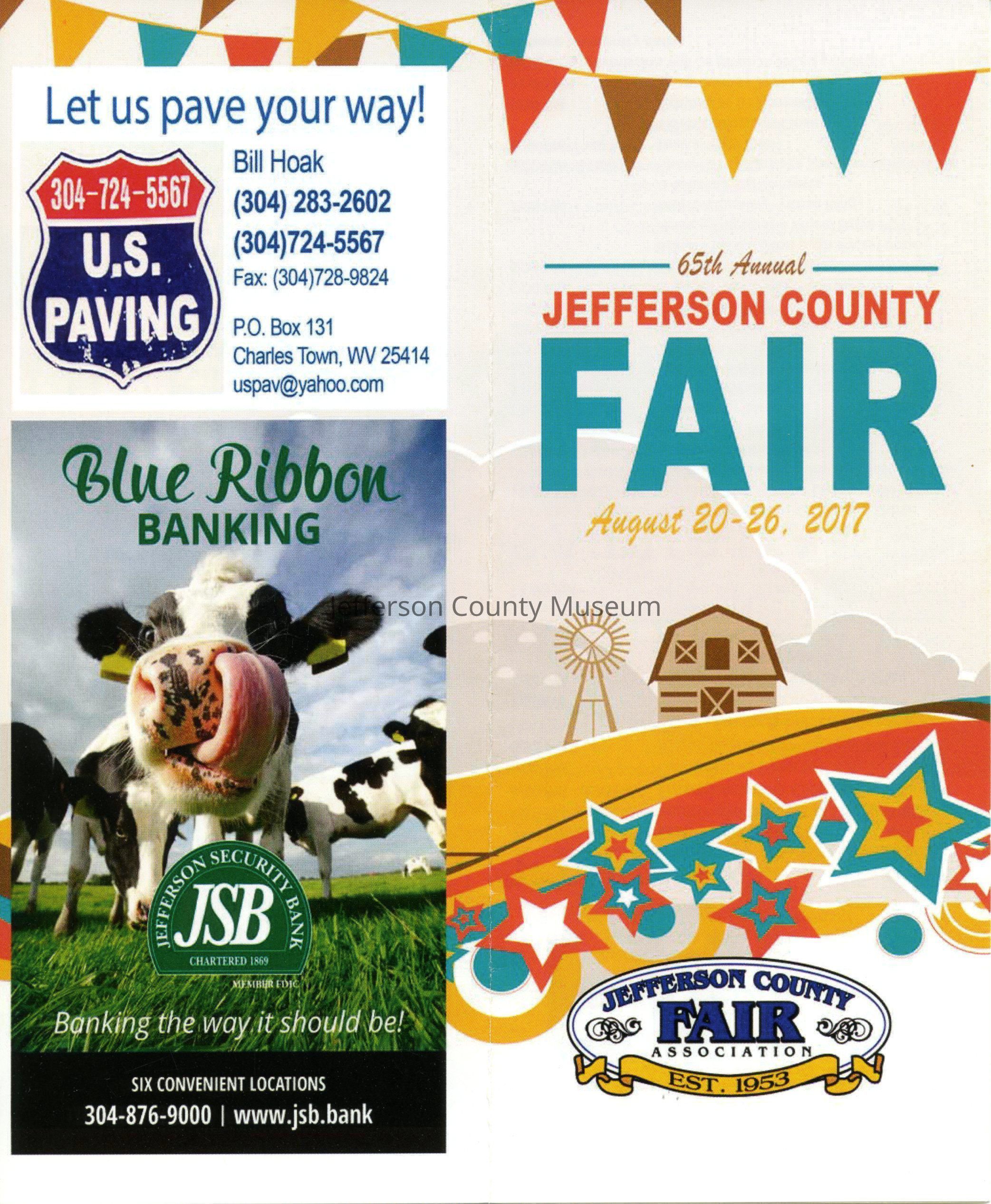 Fold-out brochure for the 65th annual Jefferson County Fair held in Jefferson County, West Virginia. Printed in color on glossy paper. Includes a schedule of events for the fair held on August 20 through August 26, 2017. Produced by the Jefferson County Fair Association, established in 1953. Opposite side of brochure includes a map of the fair grounds and ads for fair sponsors.Acquisition
