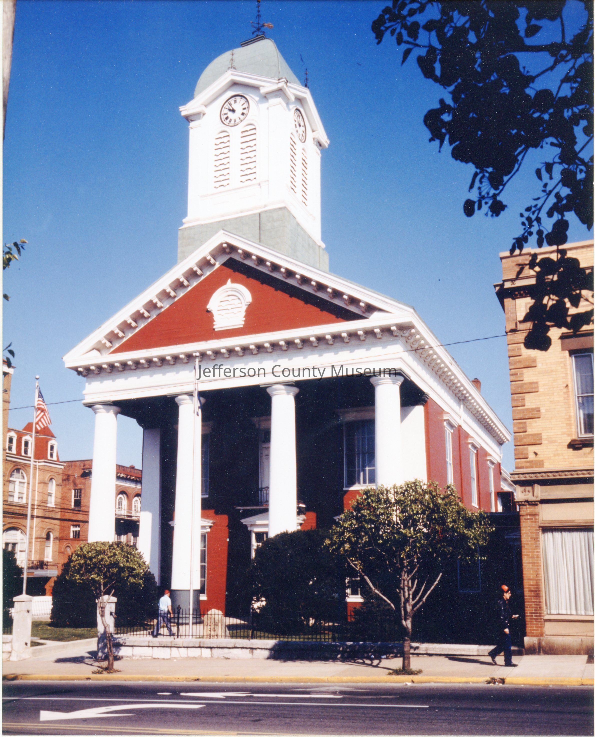 Jefferson County court house. Man in blue shirt walking into court house. Man in black shirt and cap on sidewalk. Signed "E. Fitzpatrick" on mat below photo on lower right.Acquisition