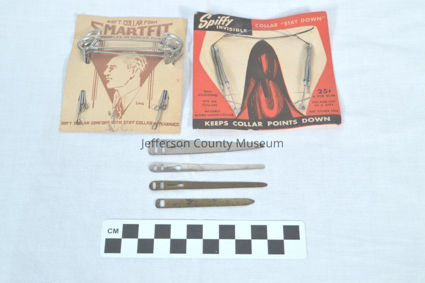 (b) Two metal collar stays in paper packaging with wording SPIFFY INVISIBLE, COLLAR "STAY DOWN," KEEPS COLLAR POINTS DOWN. Instructions on how to use collar stays on back of packaging.