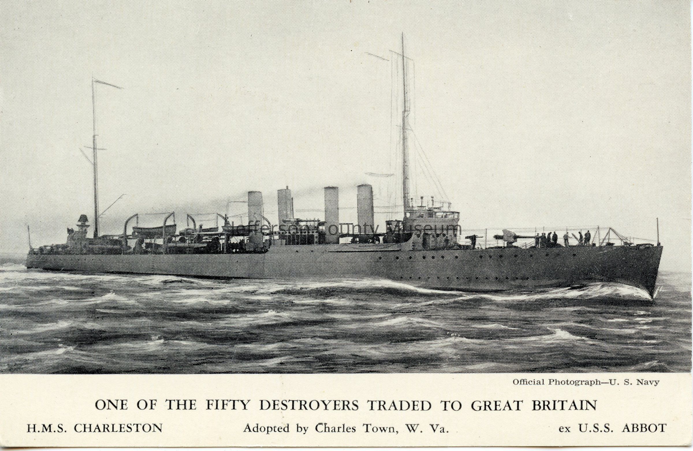 Front of card shows ship steaming along in the ocean. At bottom "Official Photograph--U.S. Navy, ONE OF THE FIFTY DESTROYERS TRADED TO GREAT BRITAIN, H.M.S. CHARLESTON, Adopted by Charles Town, W. Va., ex U.S.S. Abbot"Acquisition