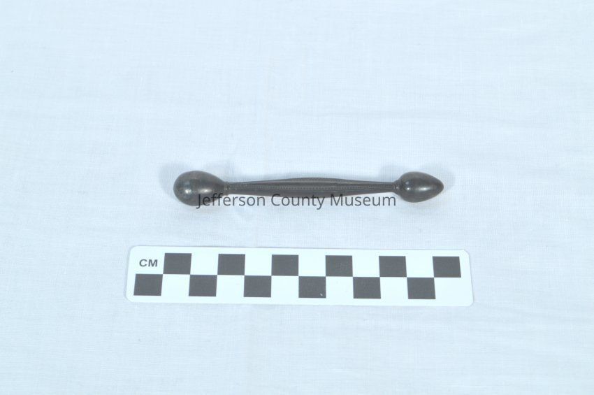 Sterling silver darning tool. Long, thin base with circle-shape on one end and oval-shape on the other end. Decorative dots along base. Tool has turned dark in color due to age.