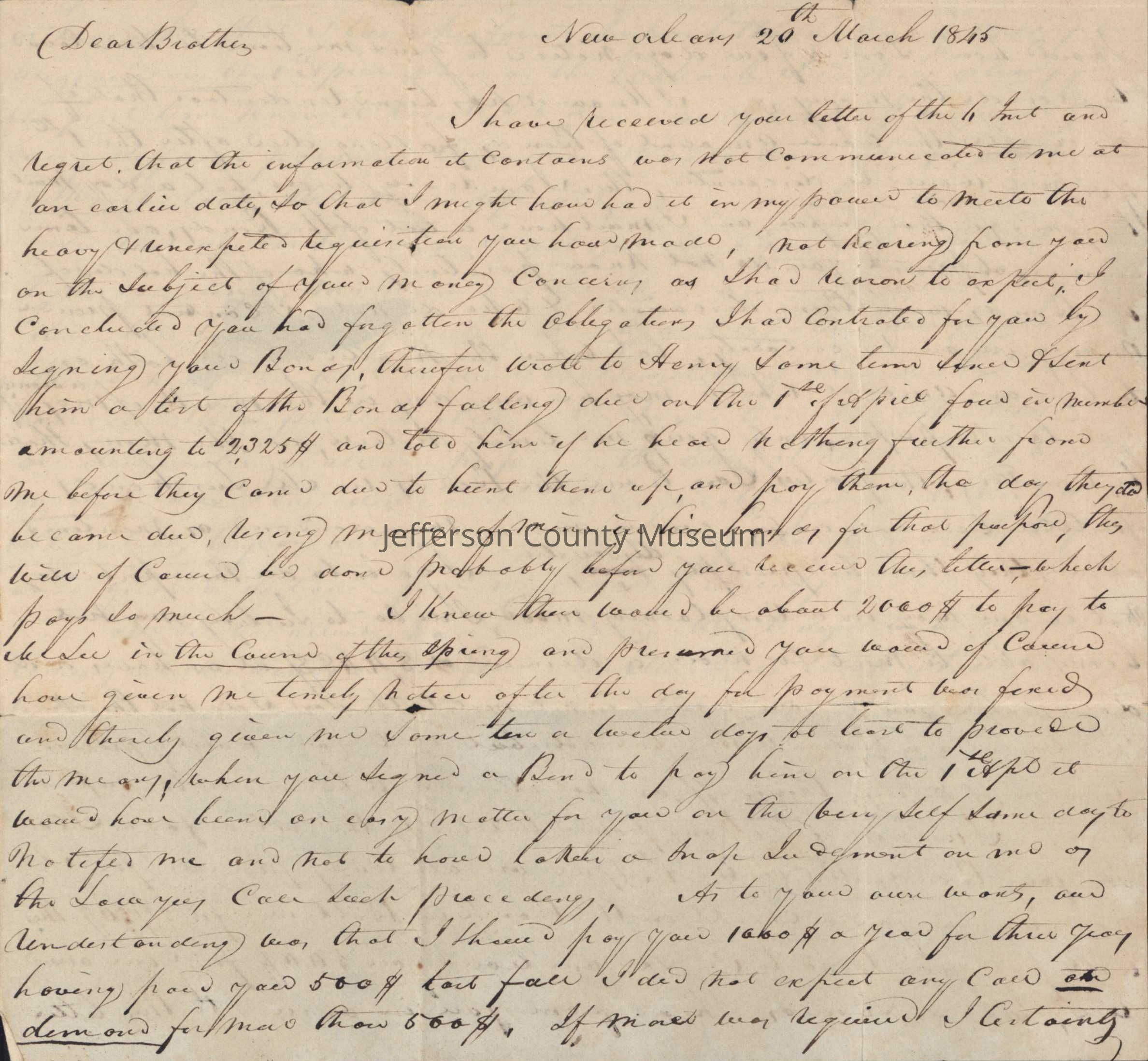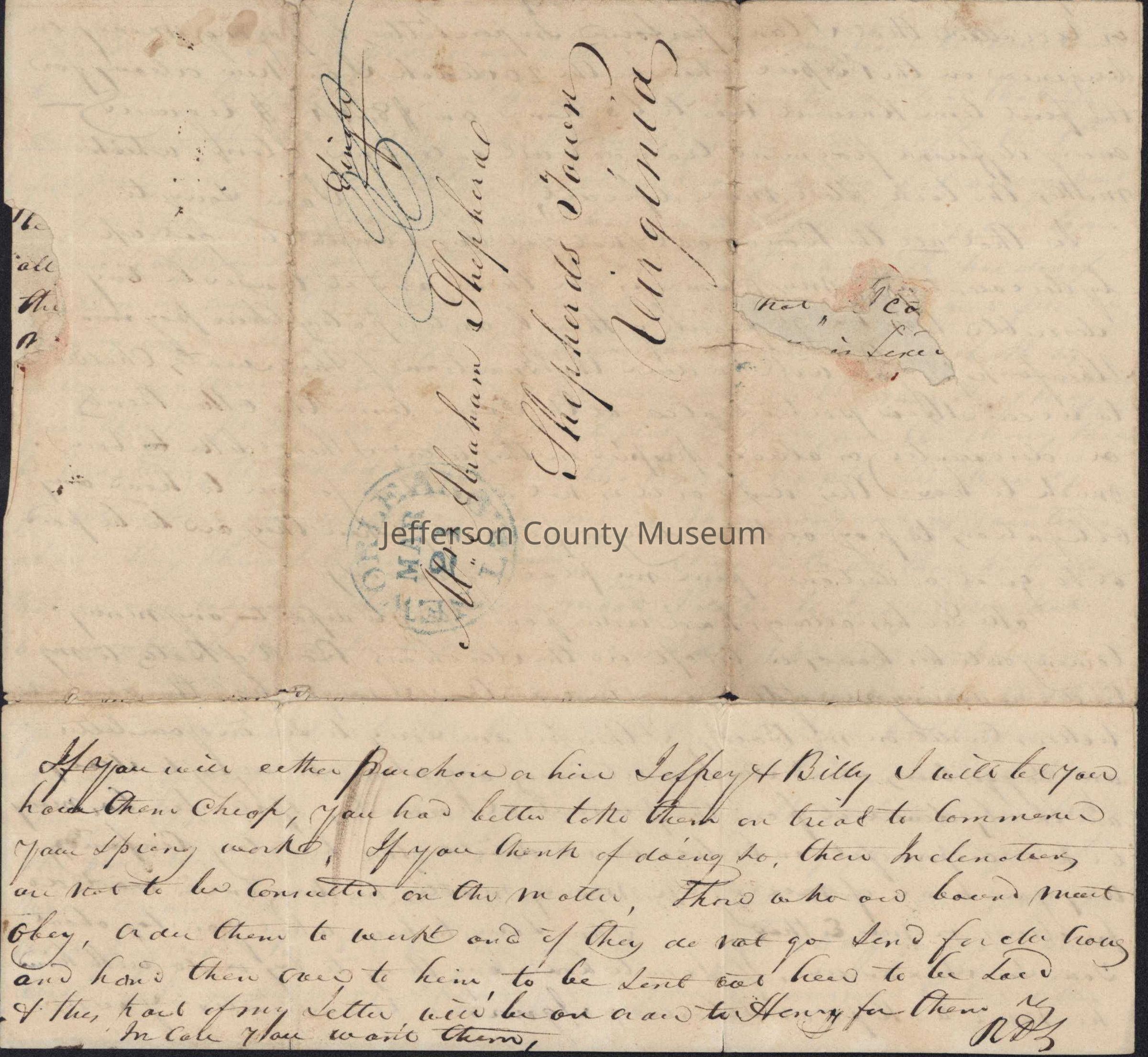 ARC661-1. Letter to Abraham Shepherd (1787-1853) (Henry St. John Shepherd's father; Henry St. John was 19 years of age.), Shepherds Town, Virginia, from his brother, Rezin D. Shepherd (1784-1865), in New Orleans, dated Mar. 20, 1845, postmarked New Orleans, La., Mar. 21 (Scans: ARC661-S-1-a-d).