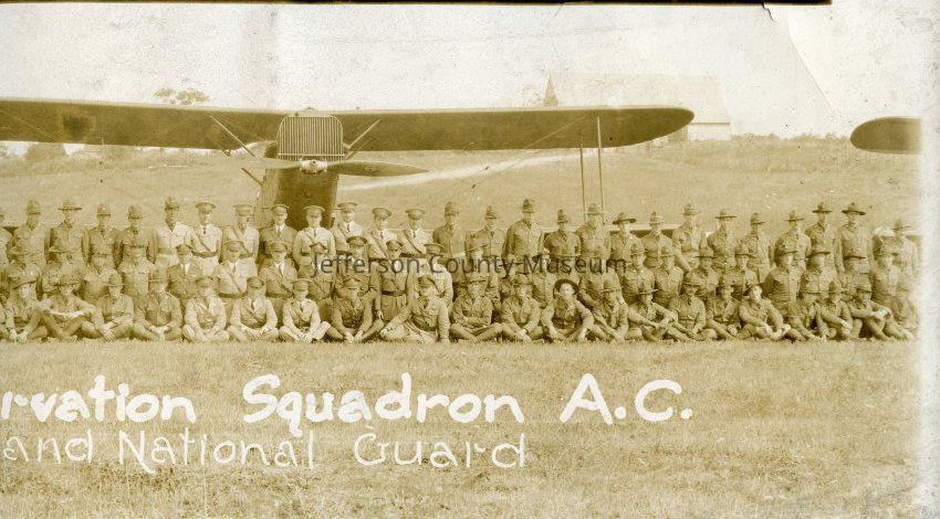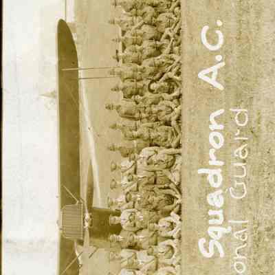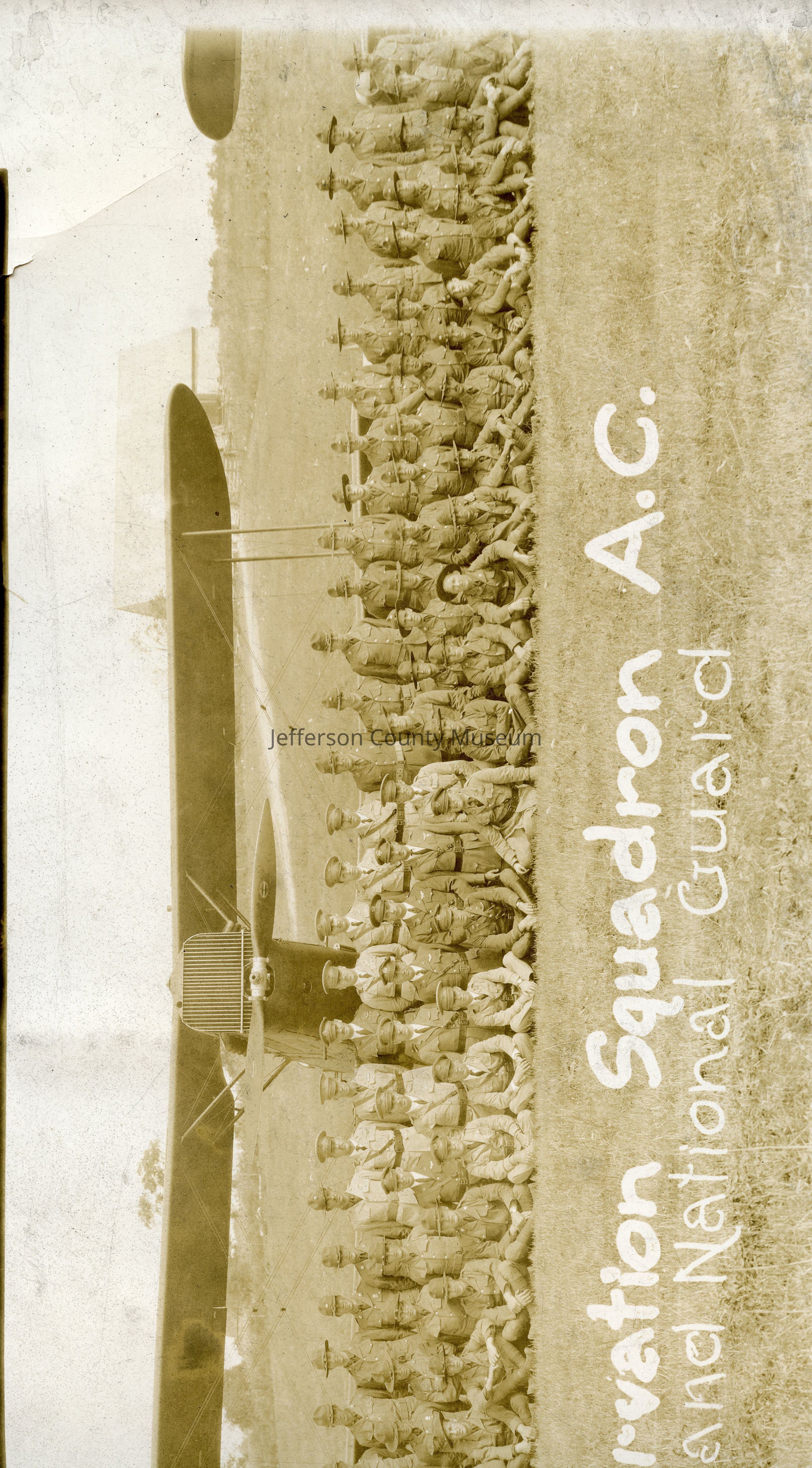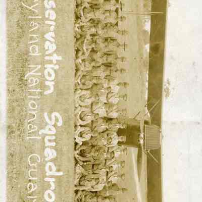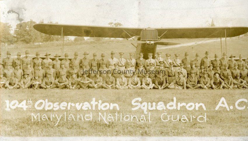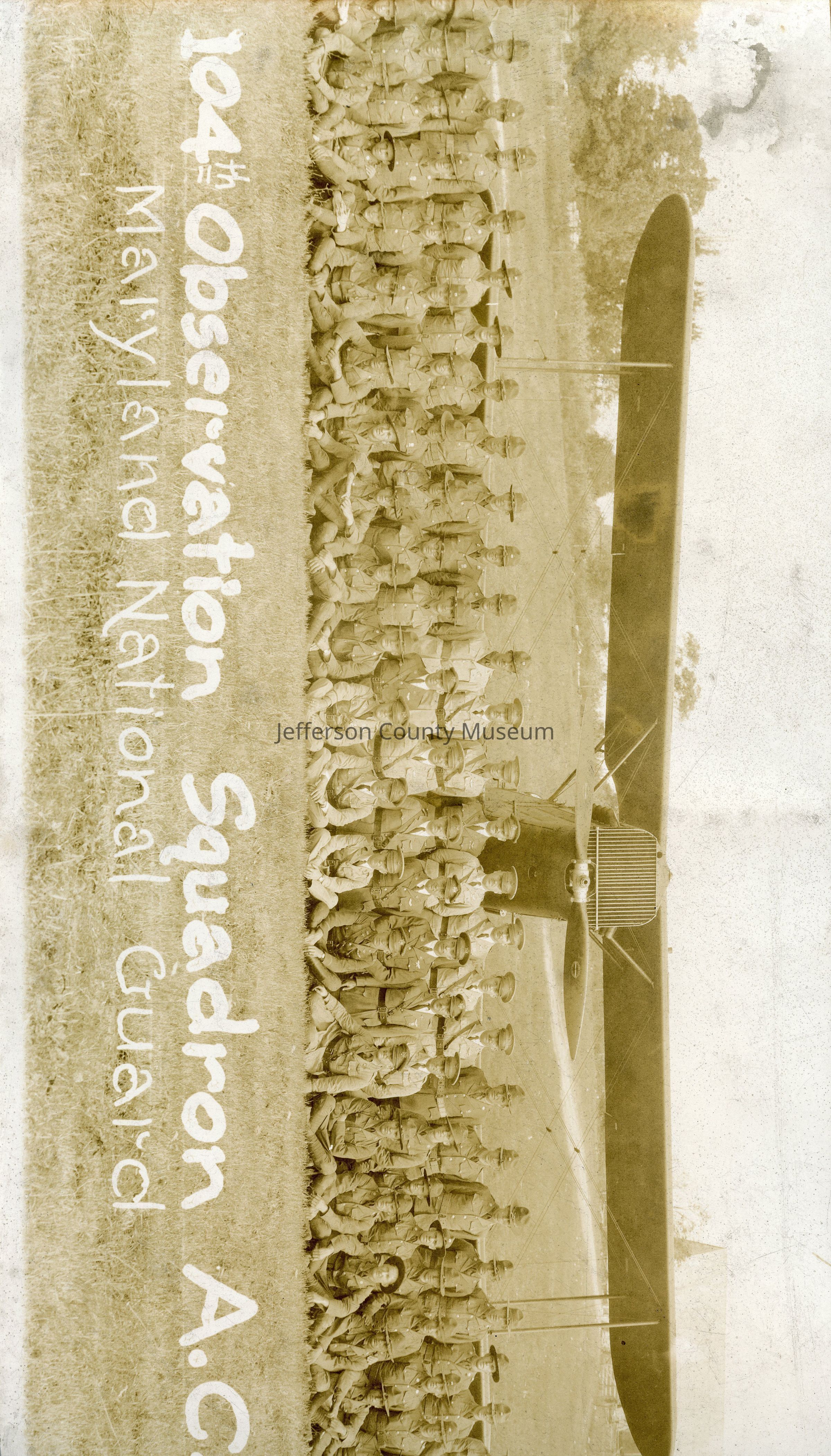 (31) Sepia-tone photo shows large group of soldiers in World War I style uniforms in front of a biplane. At bottom of photo "104th Observation Squadron A.C. Maryland National Guard". Barn in right background. c1925. Gordon Gay identified the photo as having been taken at Shepherd Flying Field, Martinsburg, West Virginia (old #s L106, 1594, LIMG5) (other # 7) -- LOCATED in oversize folder -- SR2/FF2/Drawer 11/Folder 1