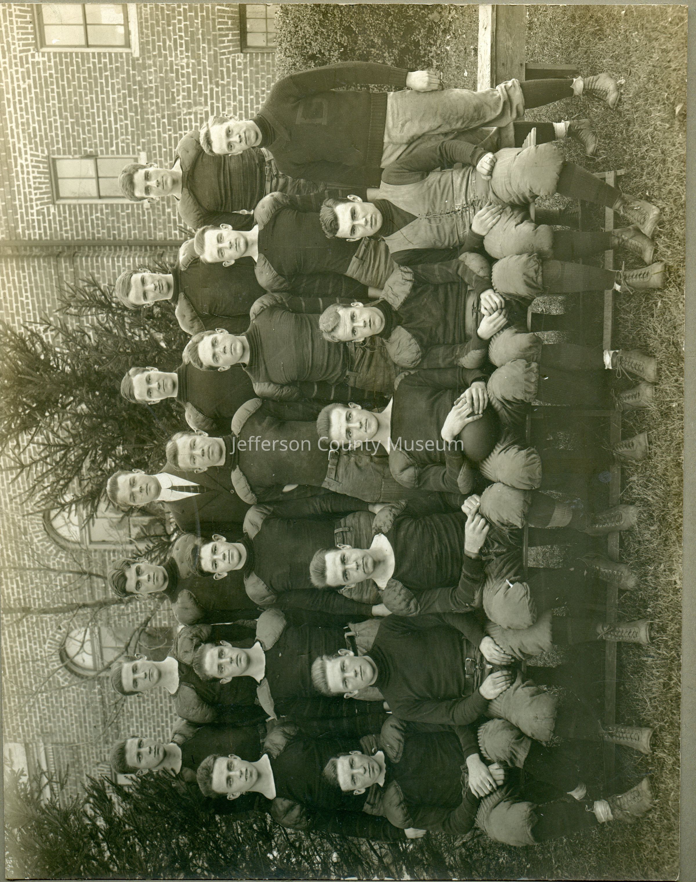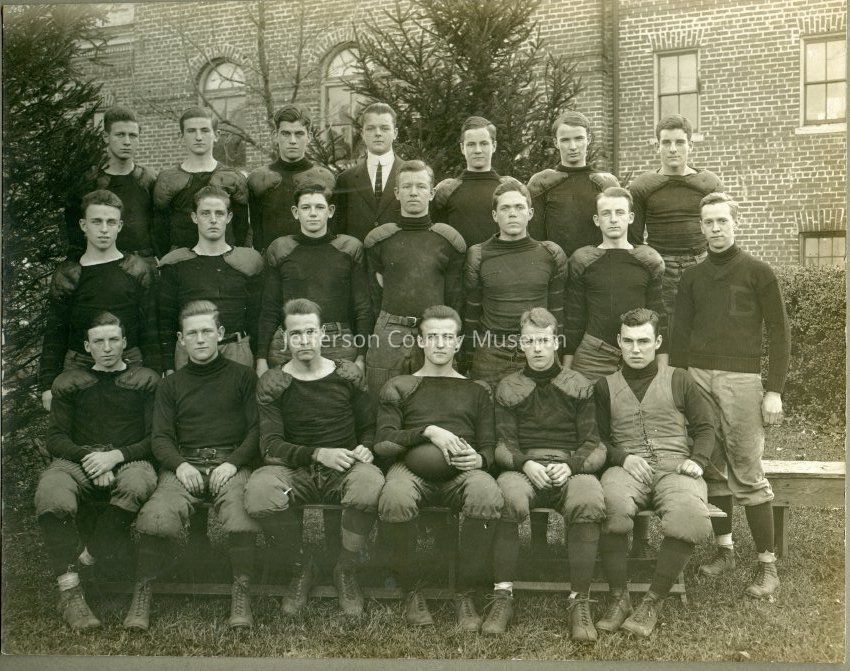 (8) Gray-tone photo of University of Virginia football team, 1909, Perry is in back row, third from left, printing on back; photo taken by University Studio, Holsinger, Charlottesville, Va. (old # LIMG8 and JCM L104)