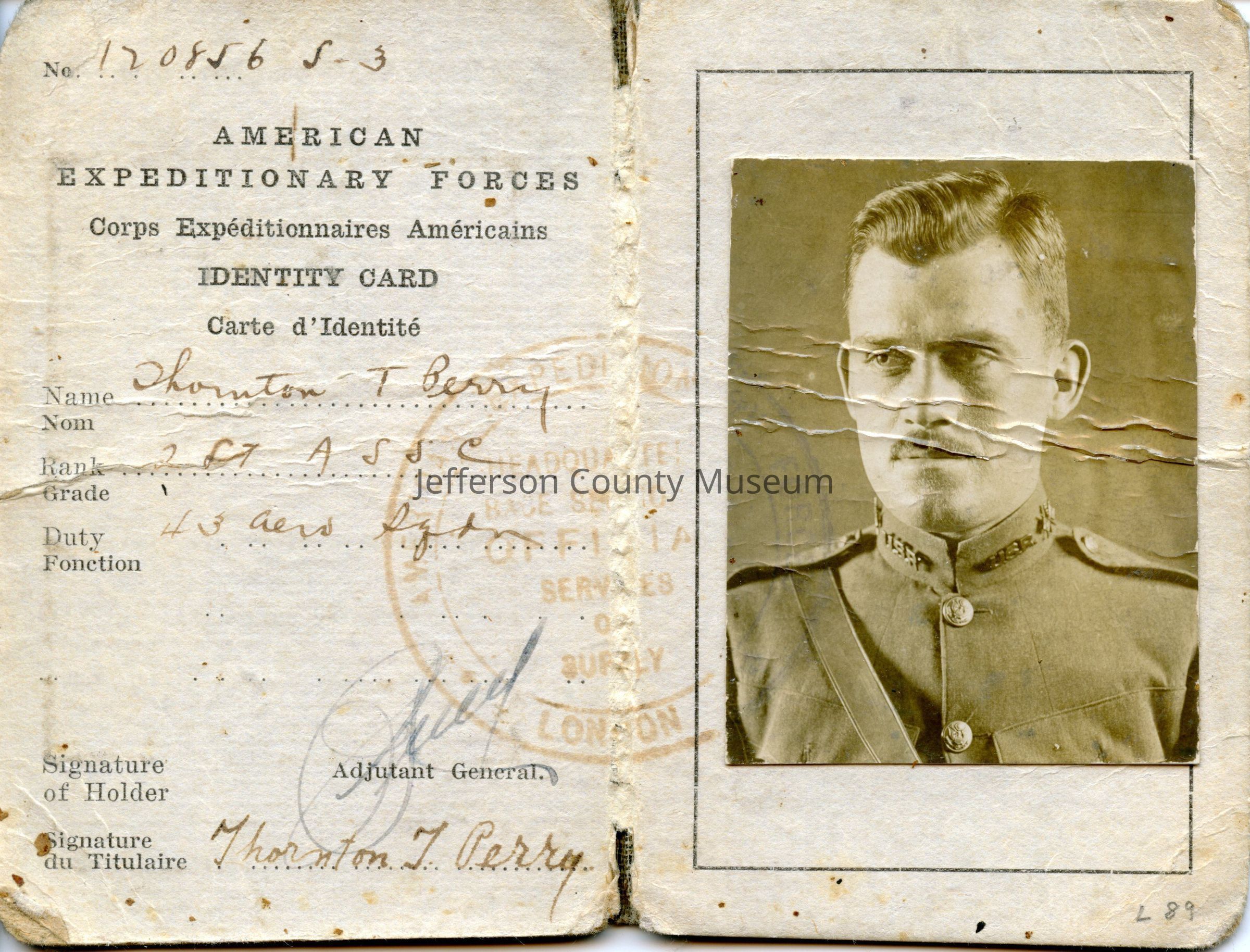 (23) Leather-backed identity card with picture of Thornton T. Perry in 2nd lieutenant uniform of the U. S. Army Air Corps in World War I; his service number at top of card "120856 5-3 AMERICAN EXPEDITIONARY FORCES"; signed at bottom "Thornton T. Perry". (old #s LIMG6, L89, 874) (other # 56)