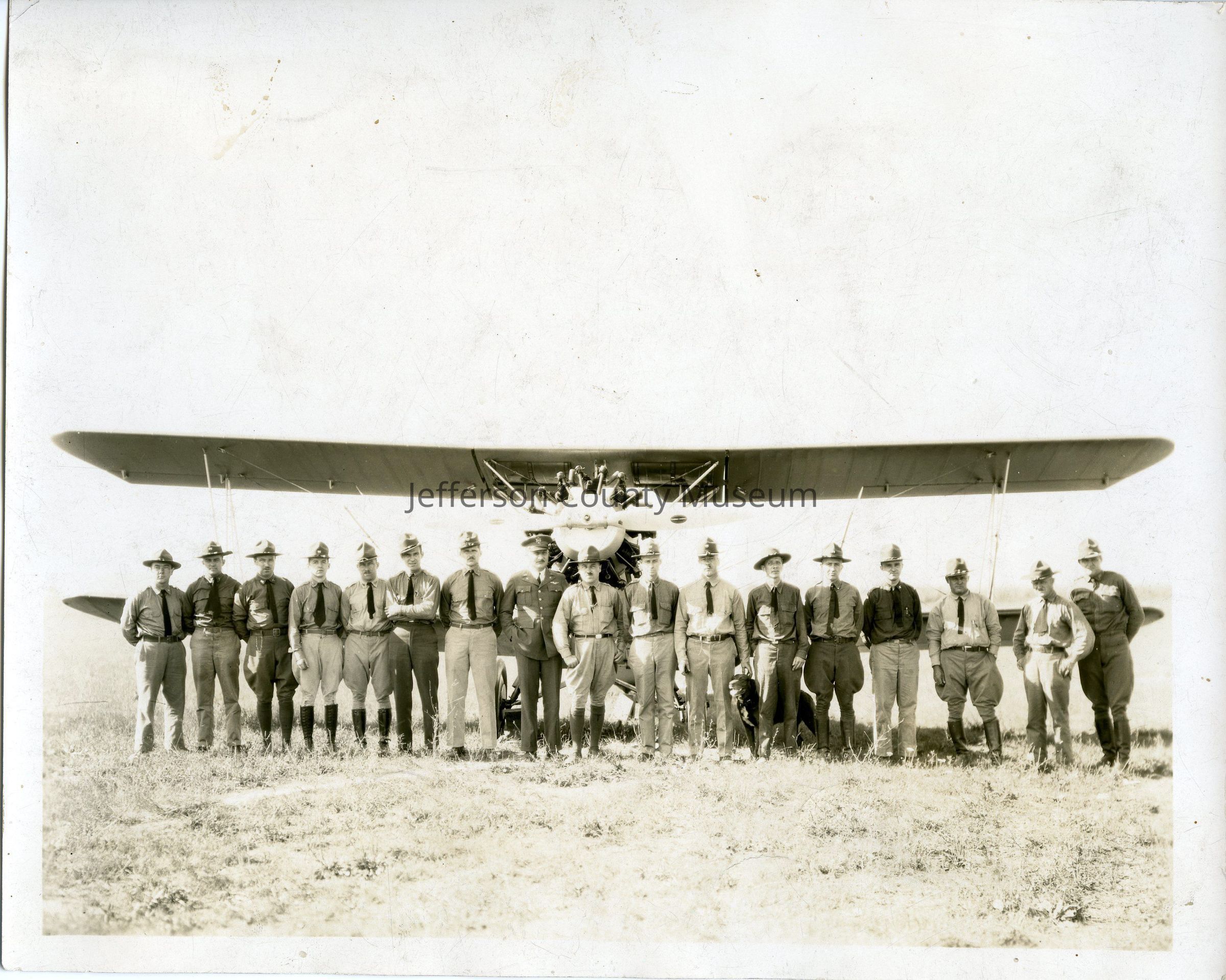 (28) 1928 black and white photo of World War I era biplane with 17 men and a black dog standing in front of it. Men include left to right, Lt. McElroy, Lt. James Whitescarver, Lt. Robert Stewart, Capt. Townsend Scott, Capt George Cobb, unknown, Capt. Charles Wasson, Major Paul Burwell, Major W. D. Tipton, commanding officer, Capt. Hoofer, Capt. H. R. Bohlman, Lt. Tilson Mudge, unknown, Lt. O. W. Snyder, Lt. George Rogers, Lt. Pat Trasers, Lt. J. F. Meehan. (See Notes and Legal for more information). Penciled on reverse: "The National Guard Air Unit officers at Logan Field Balto Md" (old #s L100, 887, LIMG4) (other # 7)