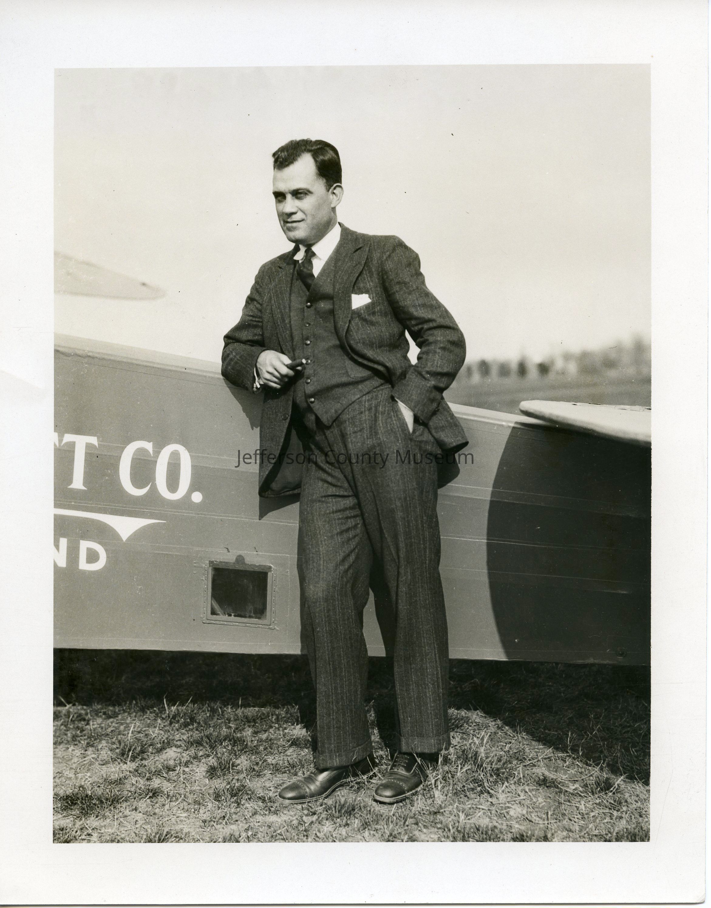 (29) 1929 black & white photo of Thornton Perry standing beside the tail of a small plane, handwritten on back: "with Curtiss-Wright", "Sept 10th 1929", and "with lots of love from your loving son Thornton"