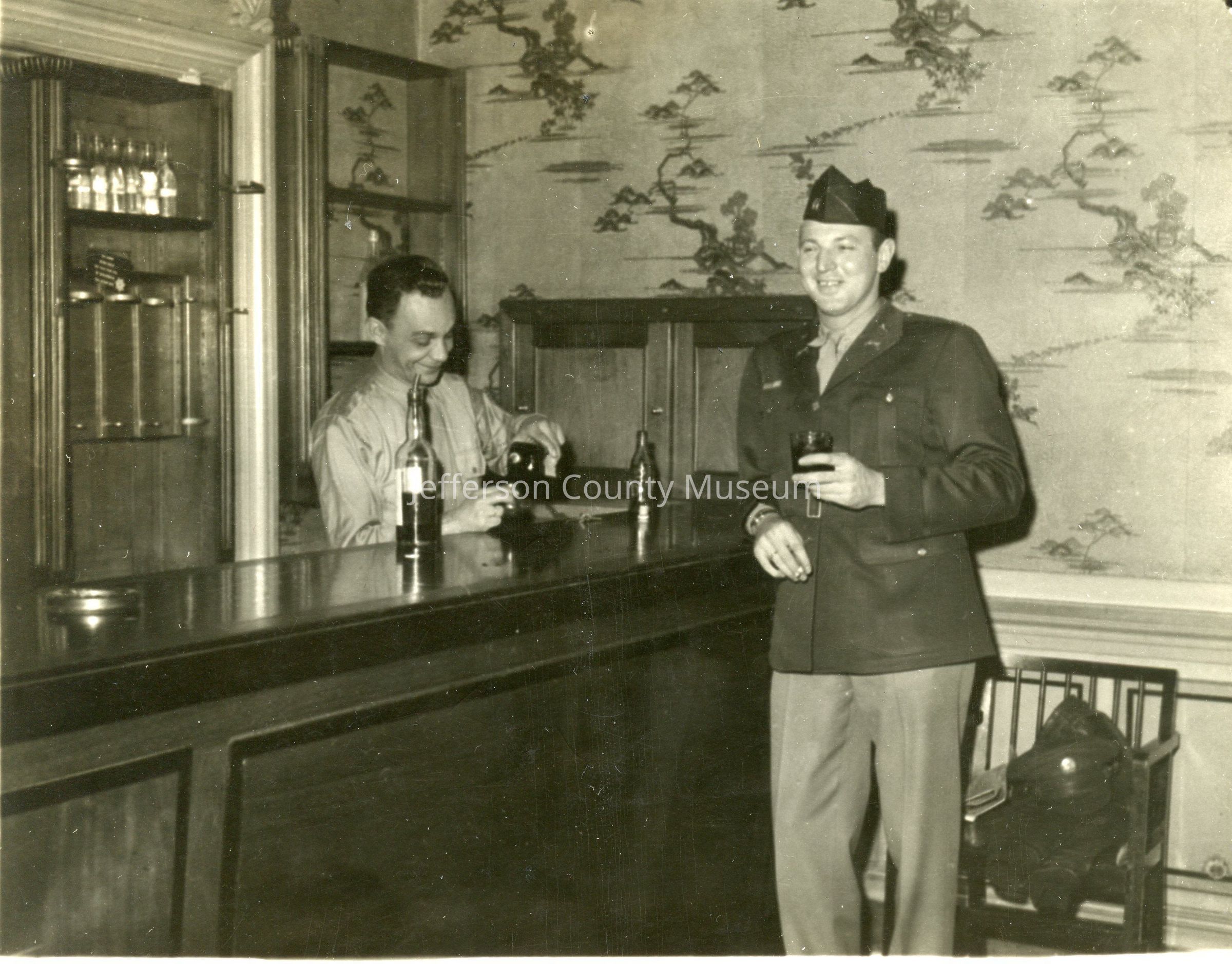 (33) Black & white photo of bar with bartender and soldier in uniform standing at bar drinking. Handwritten on back in pencil "Capt. Piersall at our little bar where we were billeted in London at club house on St. James St. Fred serving" (old #s L105, 1593, LIMG3) (other # 1)