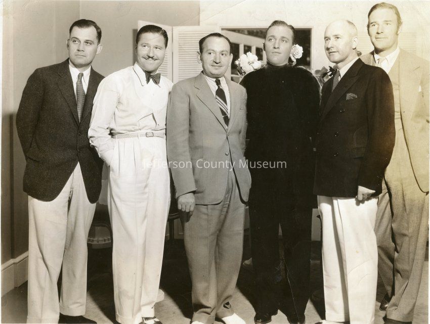 (48) Black & white photo of 6 men standing, Thornton Perry is on left. Printed along lower edge: "Copr. 1935, Paramount Productions, Inc. Permission granted for Newspaper and Magazine reproductions. (Made in U.S.A.)". Penciled on reverse: "Left to right -- Thornton T. Perry / Jack Oakie / Producer / Bing Crosby / Dan Yowell / Randolph Scott". (old # LIMG7 L99, other # 20, 886) (there also is a scanned copy)