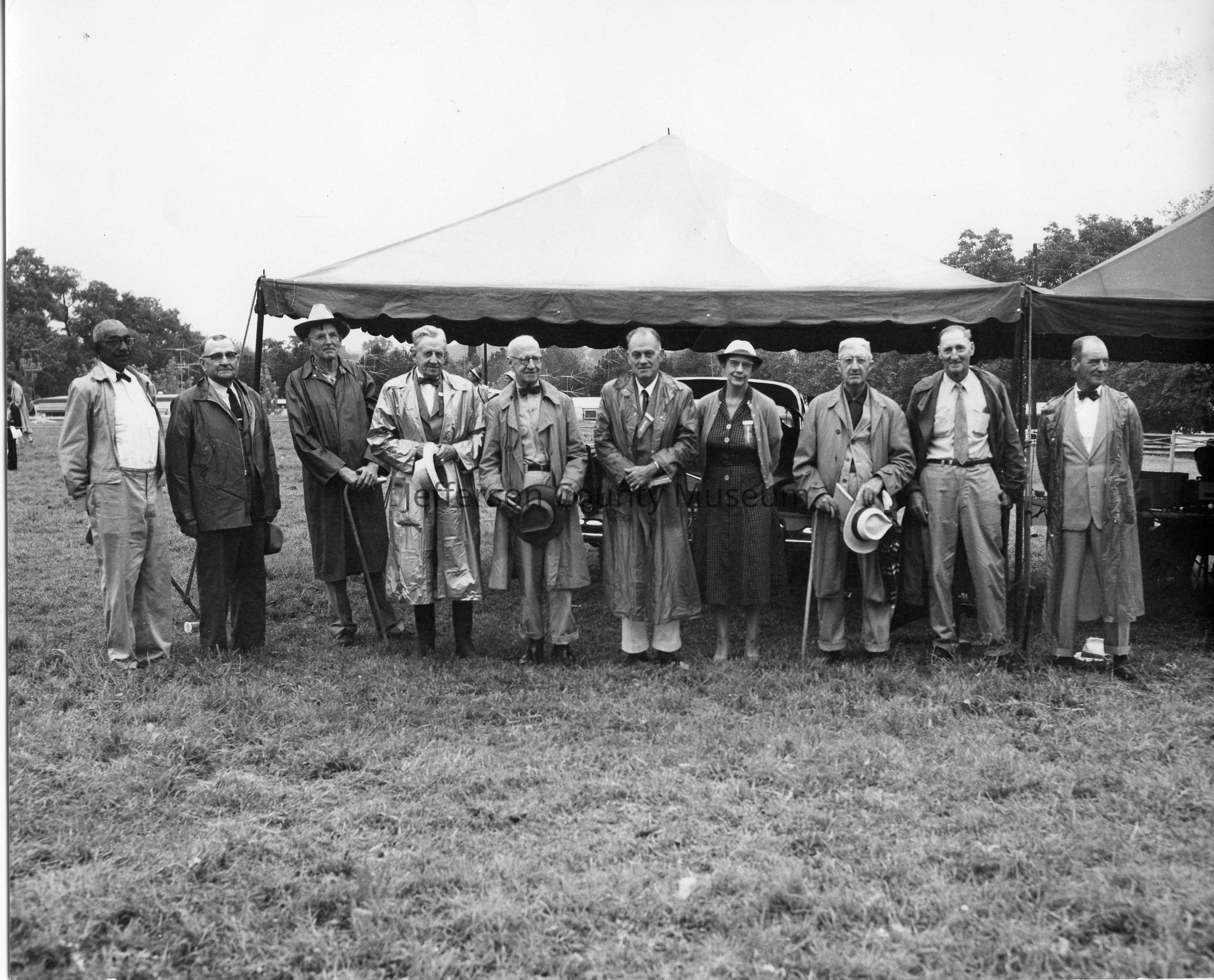 (75) Black & white photograph of nine men and one woman standing in front of tent, Thornton Perry is in center (sixth from left), fifth from left is J. M. Trapnell, the woman may be Frances Wysong; photo is not dated or identified, but was in an envelope identified as Charles Town Horse Show Officials (other # 19)