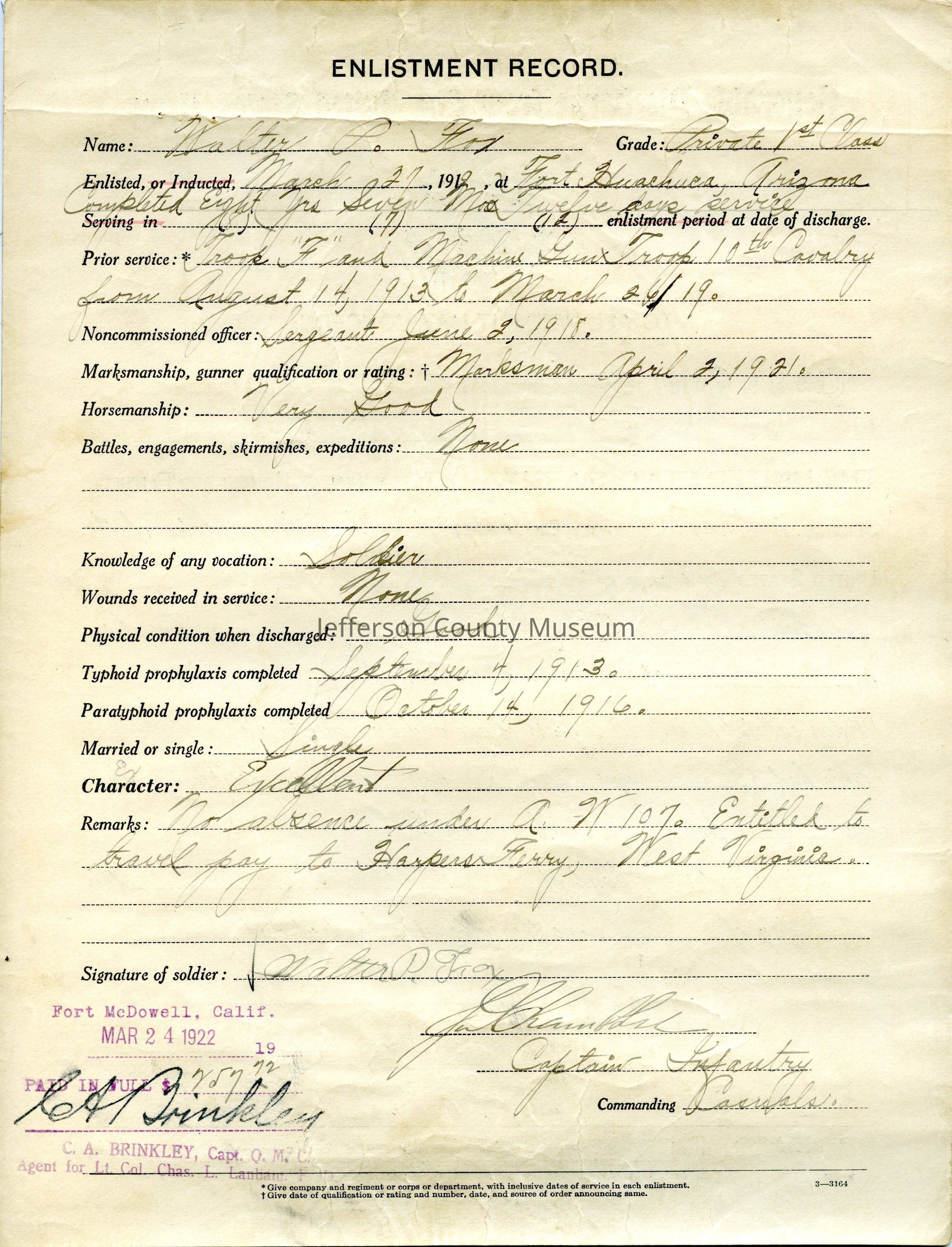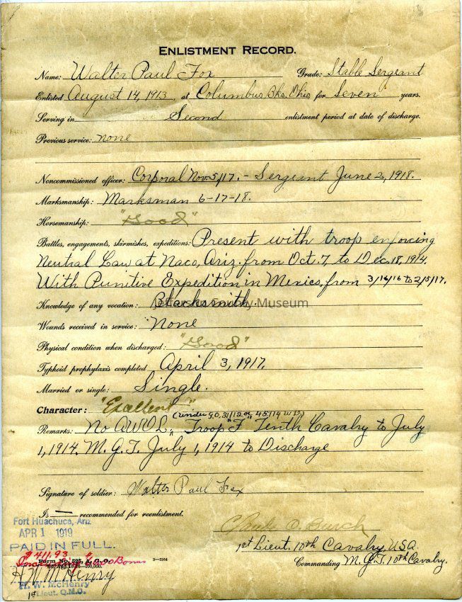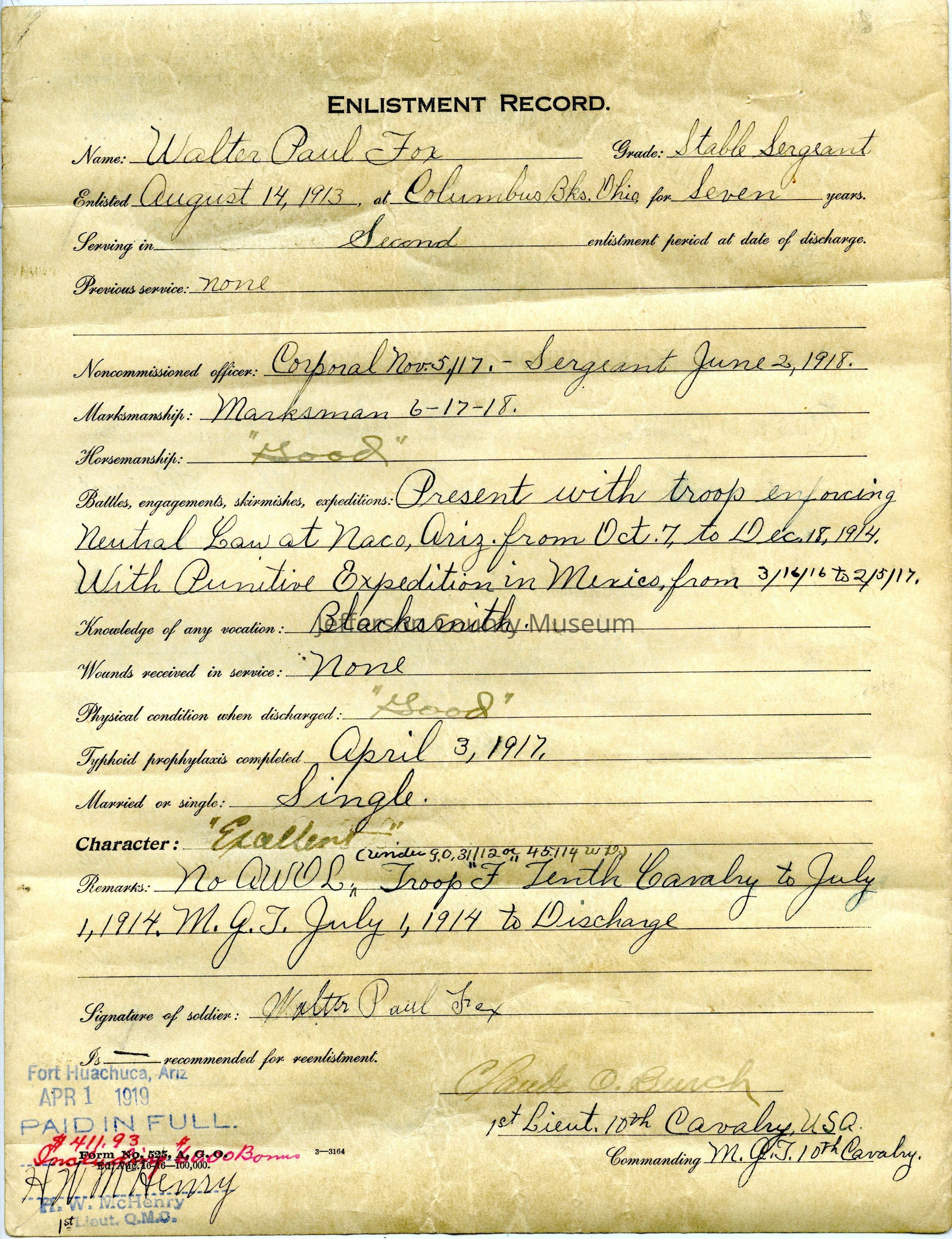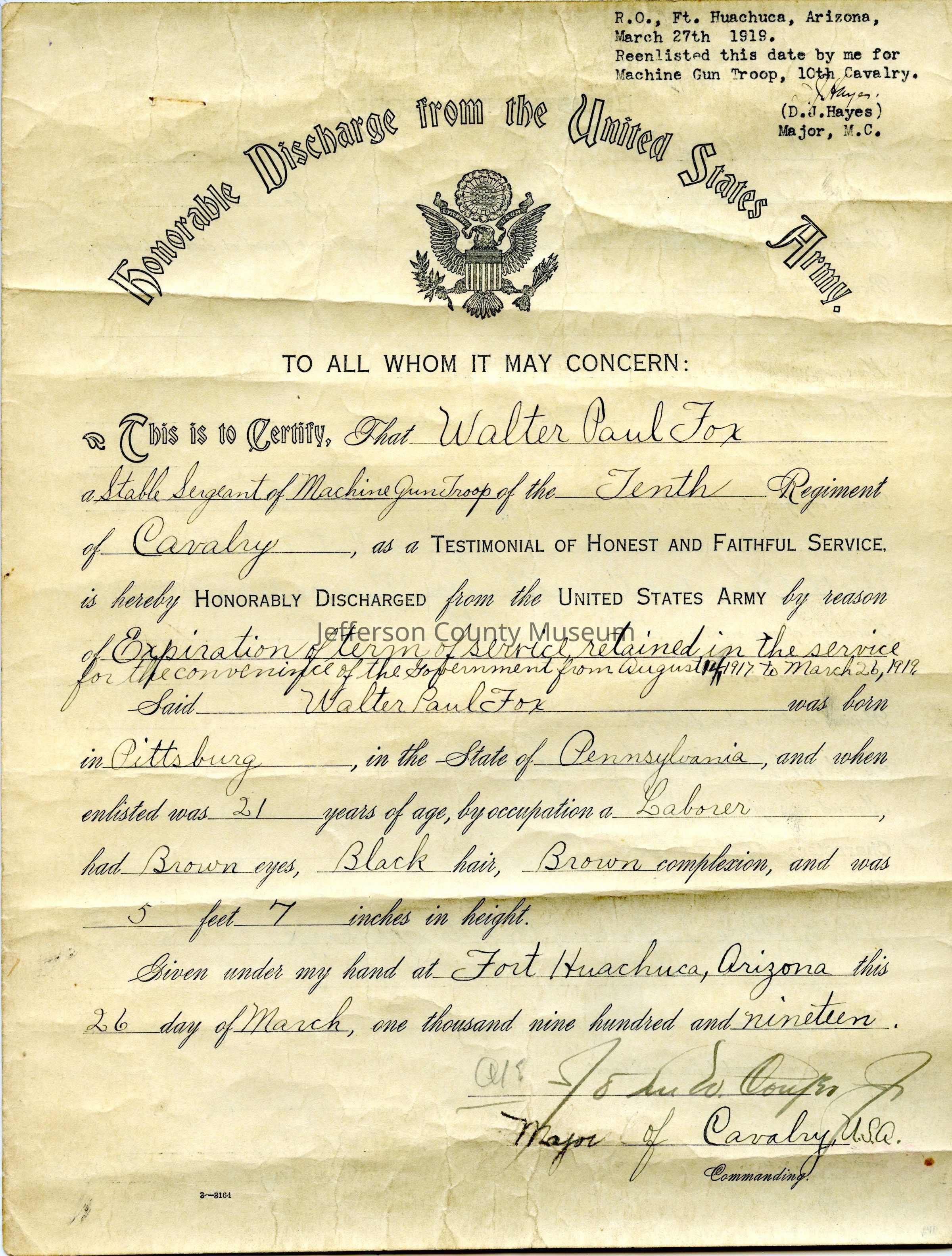 ARC687-7 Honorable Discharge certificate issued to Walter Paul Fox, dated March 16, 1919; typed in upper right corner that he re-enlisted on March 27, 1919, in the Machine Gun Troop, 10th Cavalry