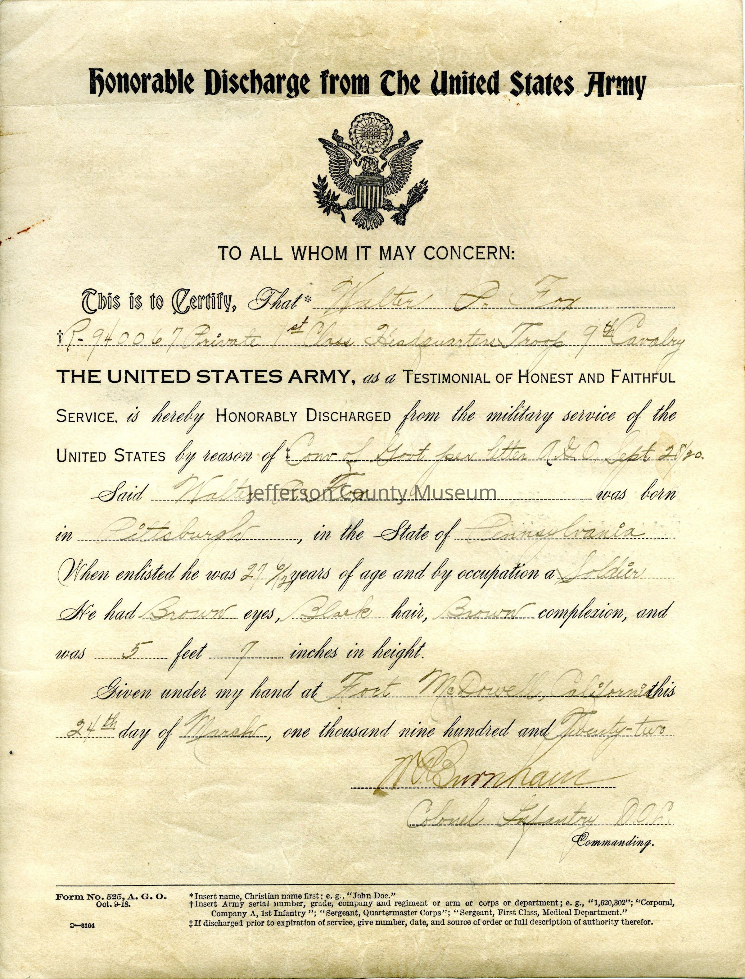 ARC687-8 Honorable Discharge certificate issued to Walter Paul Fox, dated March 24, 1922, discharged from the 9th Cavalry