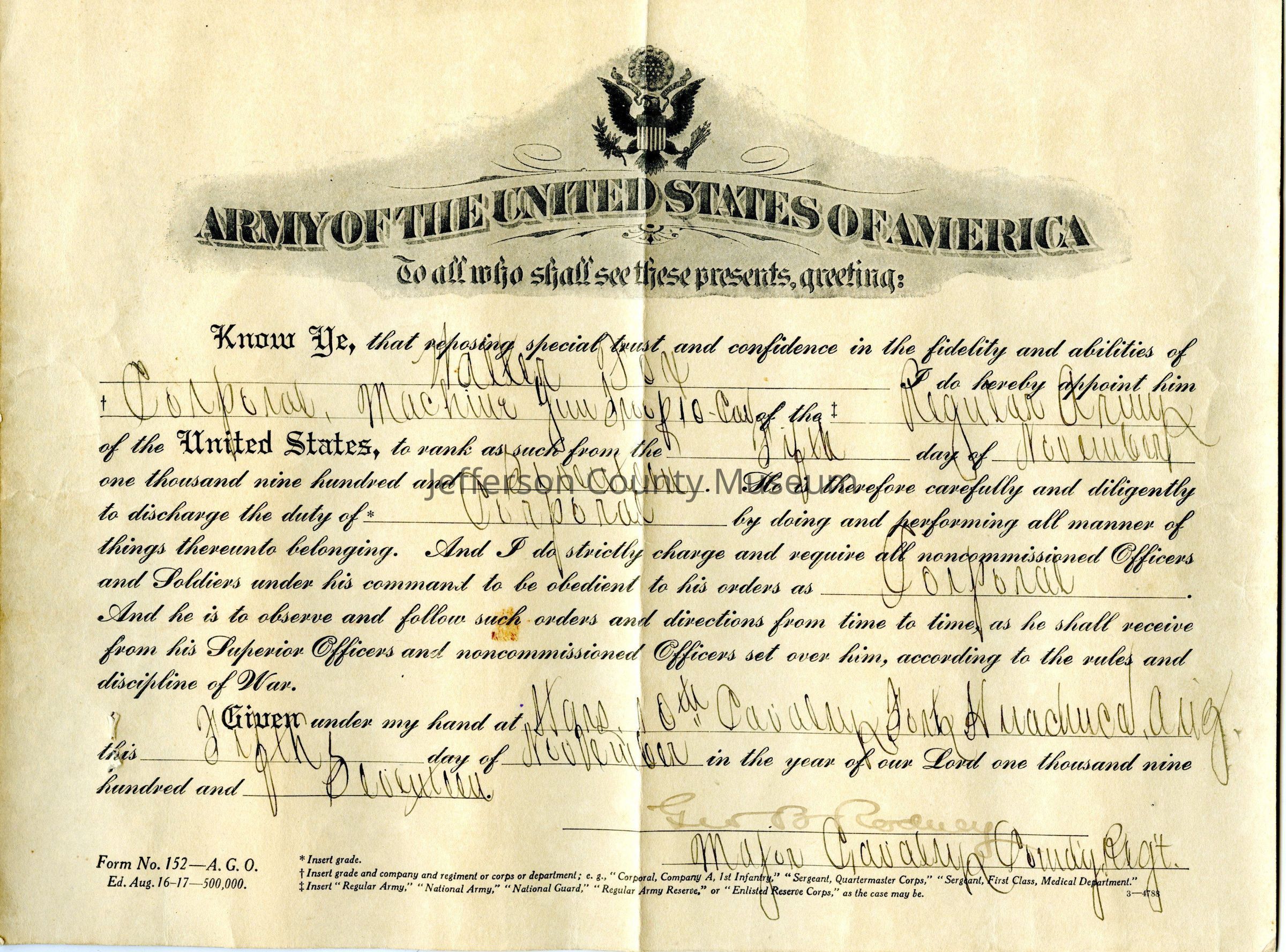ARC687-9 Certificate appointing Walter Paul Fox a corporal, Machine Gun Troop, 10th Cavalry, Regular Army; dated Nov 5, 1917