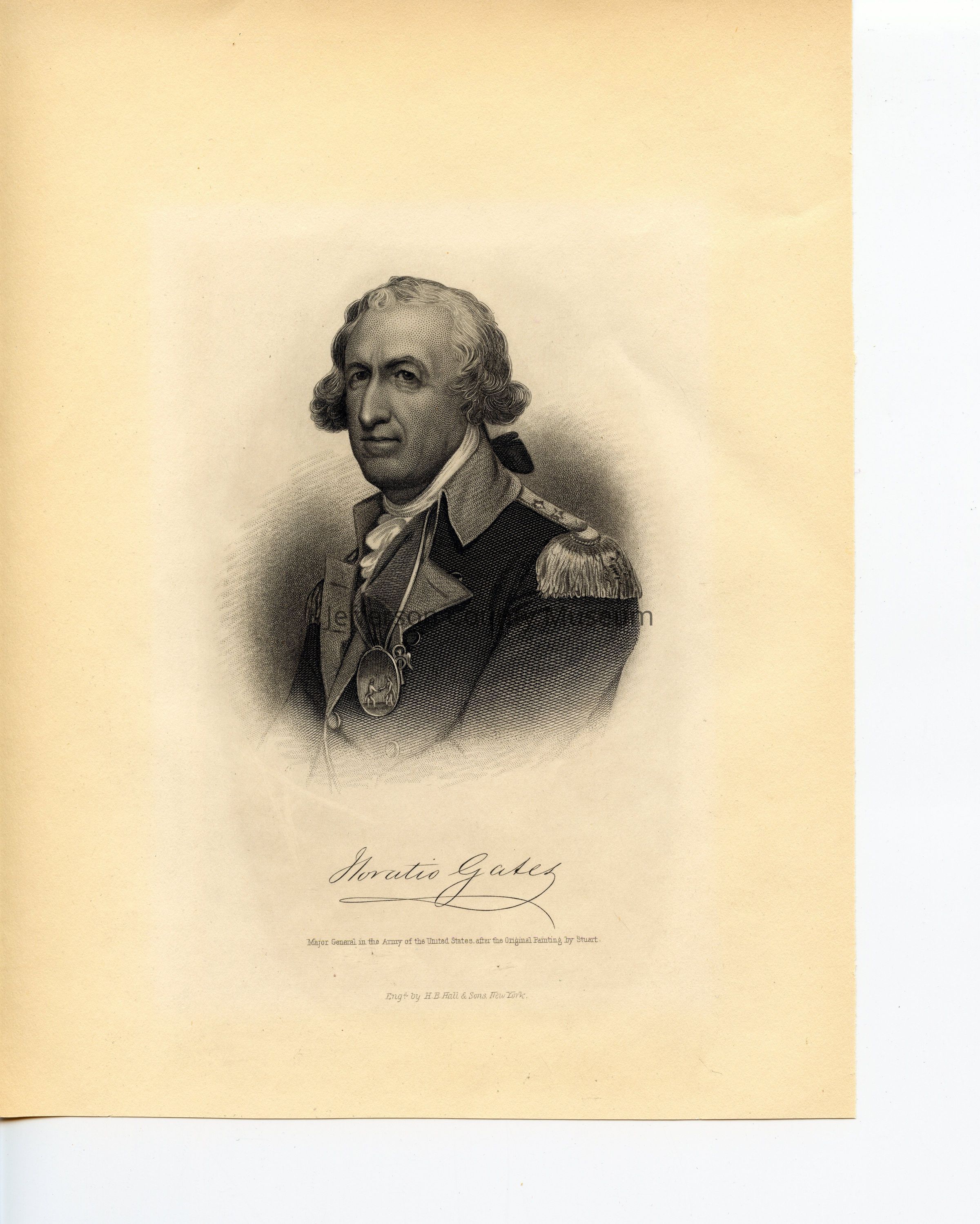 Major General Horatio Gates. Three quarter profile of Gates in uniform with medal around neck. "Major General in the Army of the United States, after the Original Painting by Stuart." At bottom "Engd. by H. B. Hall & Sons, New York". Steel engraving.Acquisition