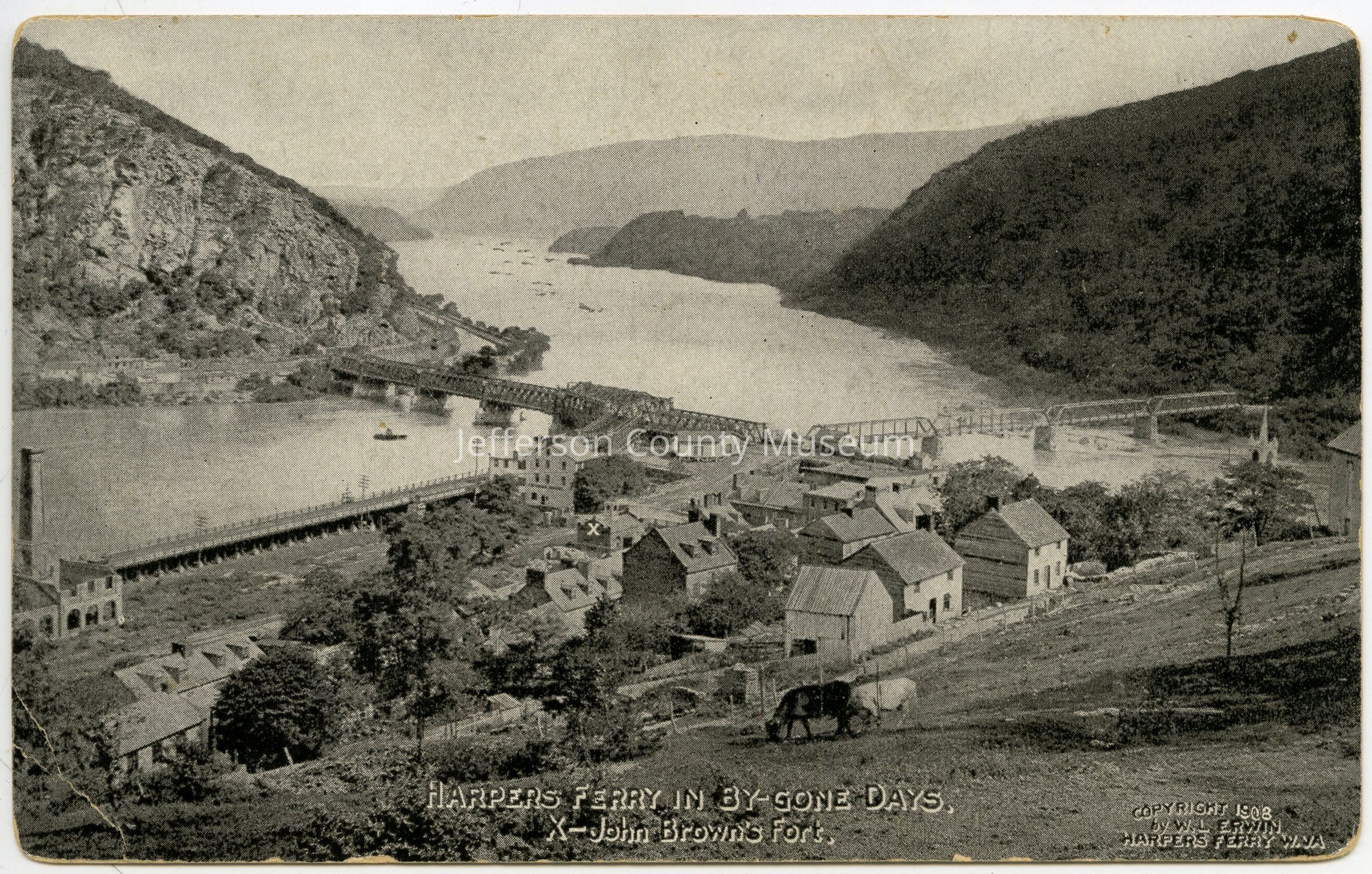 Harpers Ferry in By-Gone Days, X - John Brown's Fort. Scenic Souvenir of Picturesque, Historic Harpers Ferry. Published by W. L. Erwin, Harpers Ferry, W. Va. Copyright 1908. "Old Charles Town Library" stamped on back of postcard.Acquisition