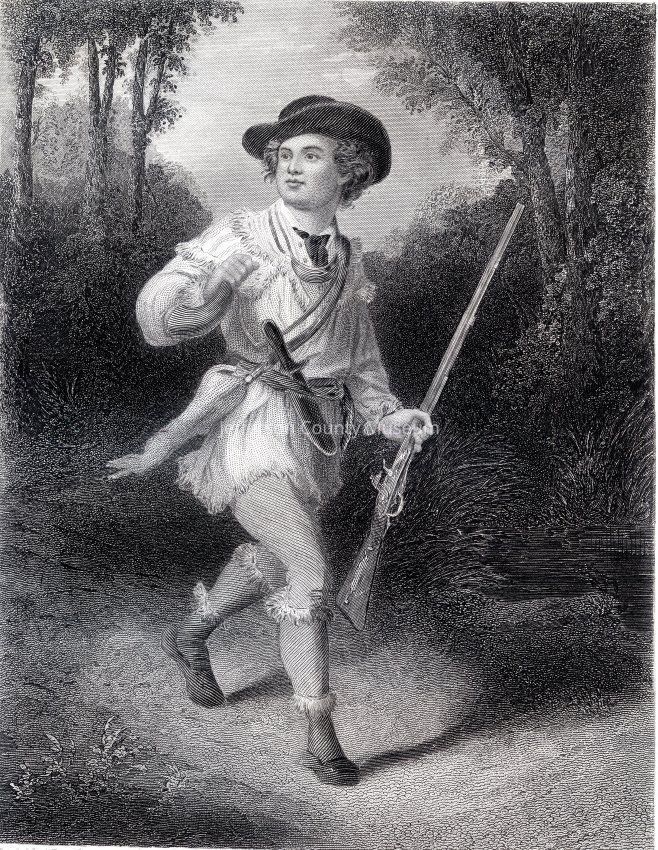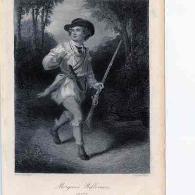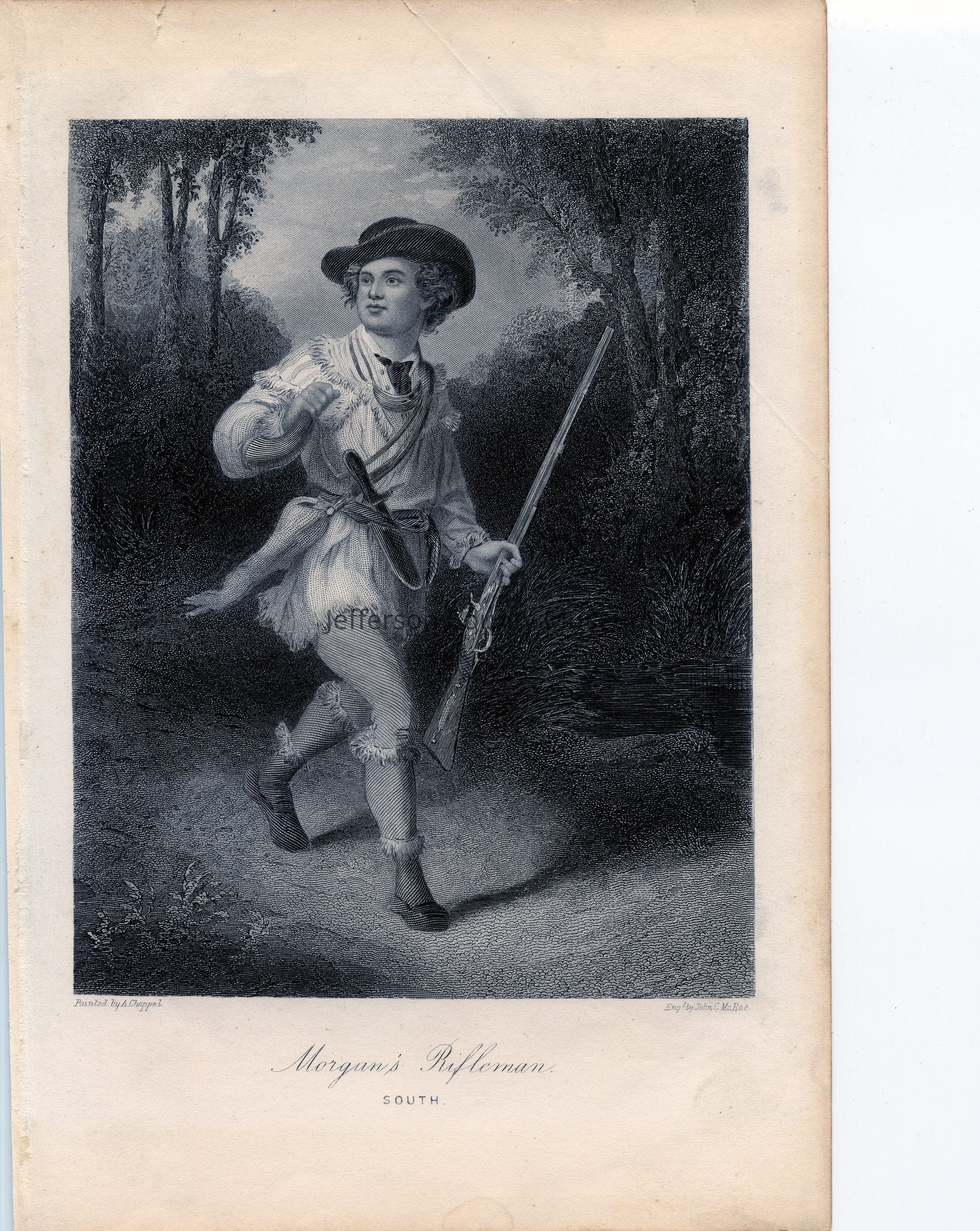 Shows Revolutionary War era rifleman wearing slouch hat, buckskin, large knife in sash belt and bag on his right side slung over left shoulder. Trees are in background on both sides of rifleman. Small stream to his left. At bottom left are words " Painted by A. Chappel ". At bottom right " Eng. By John C. McRae ". In center below engraving are words in script " Morgans's Rifleman ." and "SOUTH ". Steel engraving.Acquisition