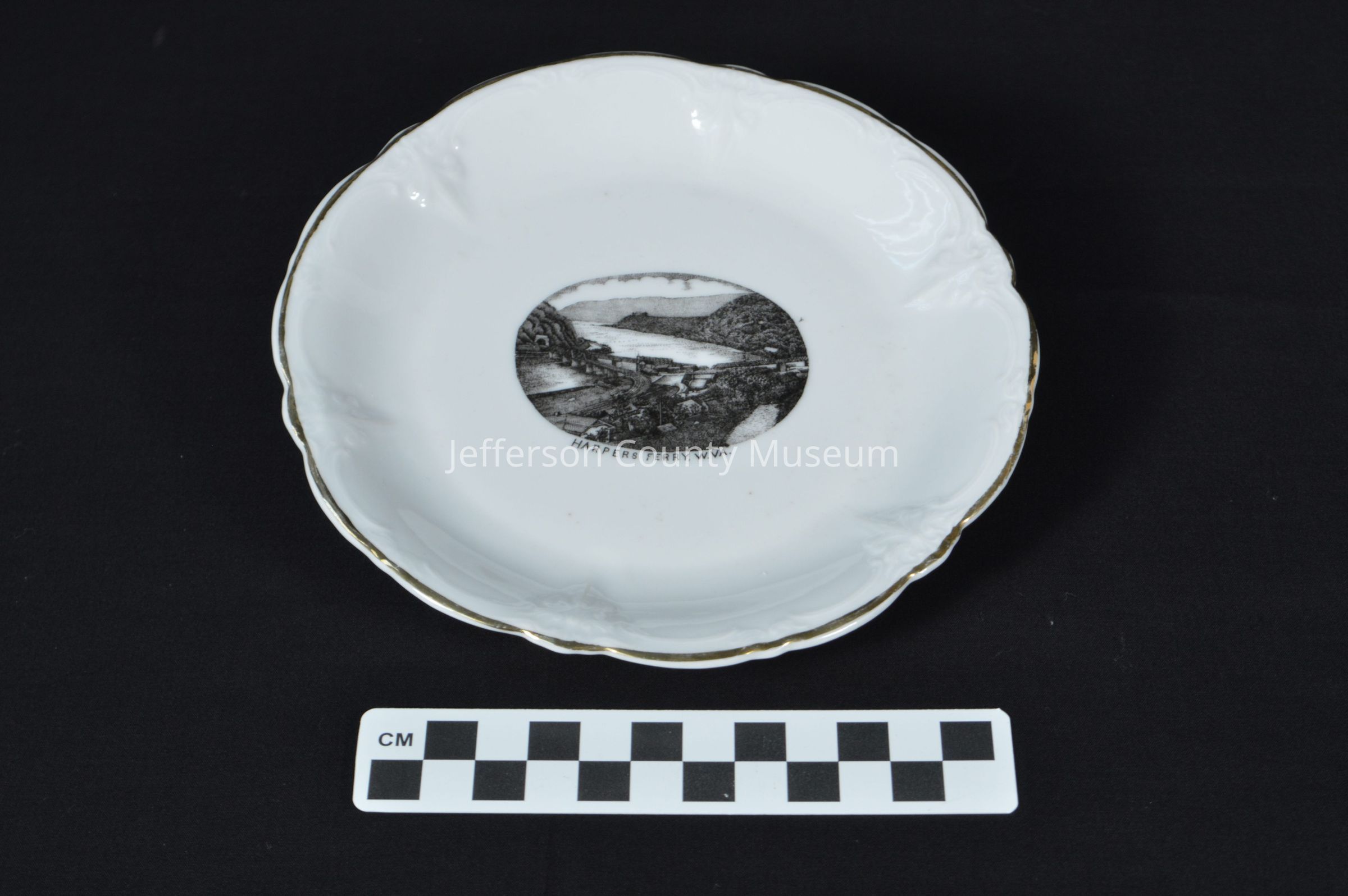 White ceramic plate with picture of Harpers Ferry in middle. Written underneath is: HARPERS FERRY, W. VA. On the back of the plate is: MADE IN GERMANY FOR W. KAPLON & BRO., HARPERS FERRY, W. VA. The Kaplon department store in Harpers Ferry may have had the plate made for a customer-appreciation gift.Context